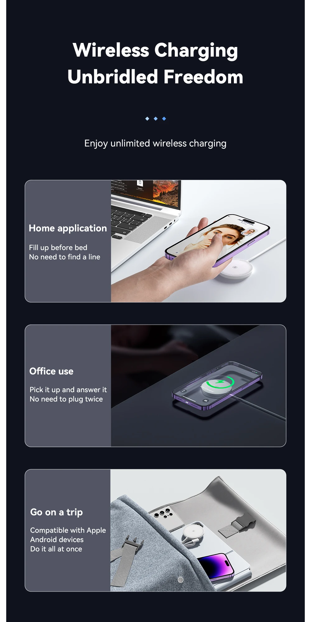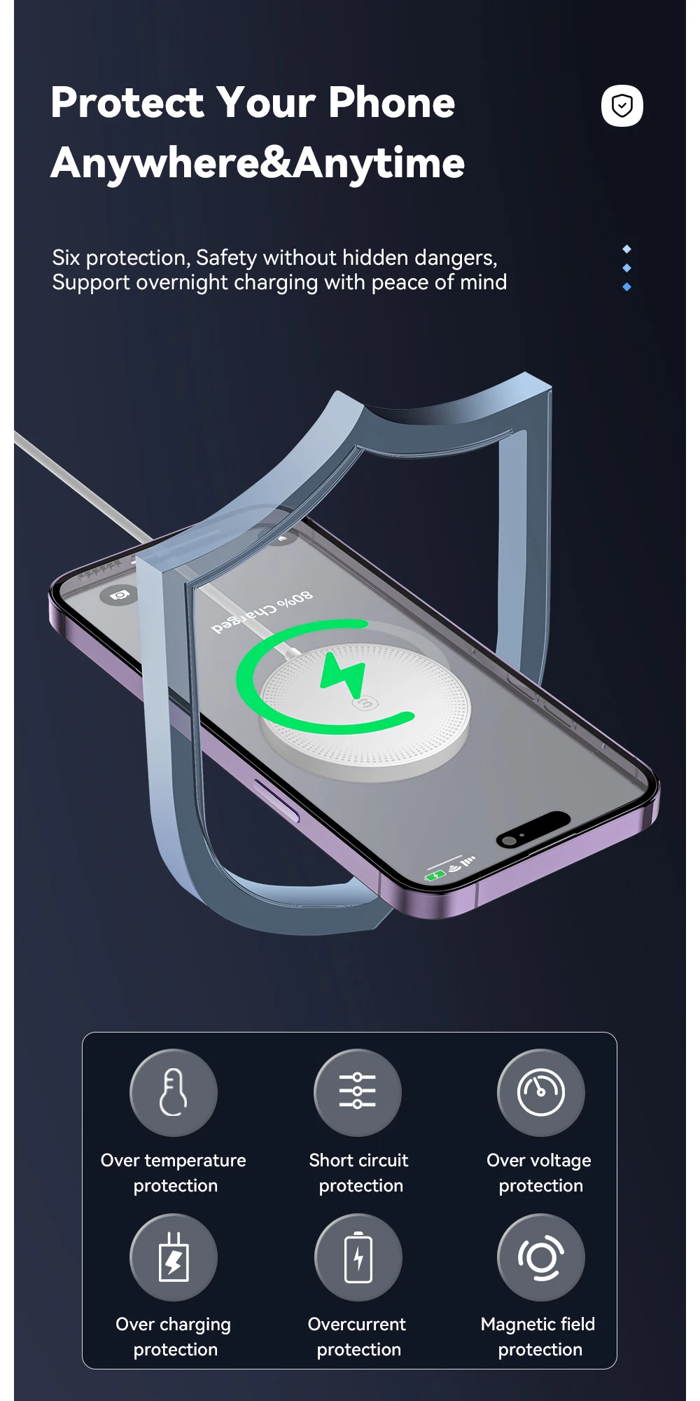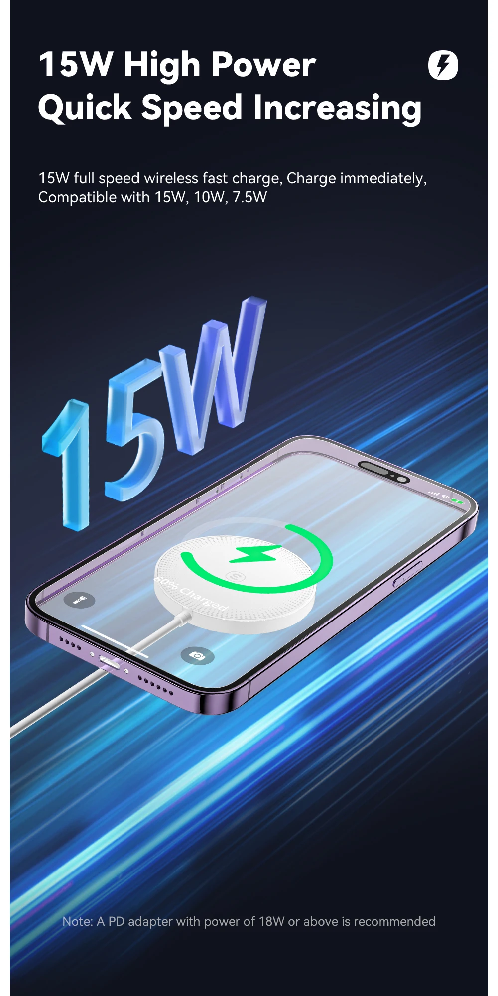 • Magnetic Design :The magnetic wireless charger features a sleek design that securely attaches to your device, providing a stable connection for efficient charging.