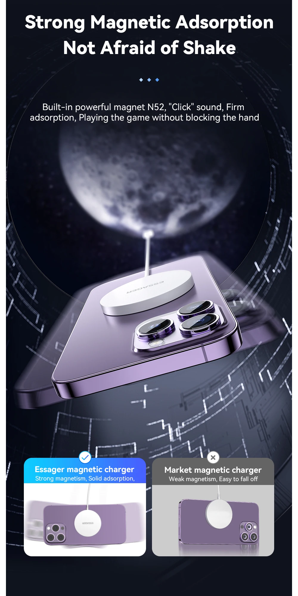 1. Slim 15w fast magnetic wireless charging customized for iPhone 12 13 14 series. We recommend you to use Essager PD 20W adapter as a perfect partner for this magnetic wireless charger. 2.