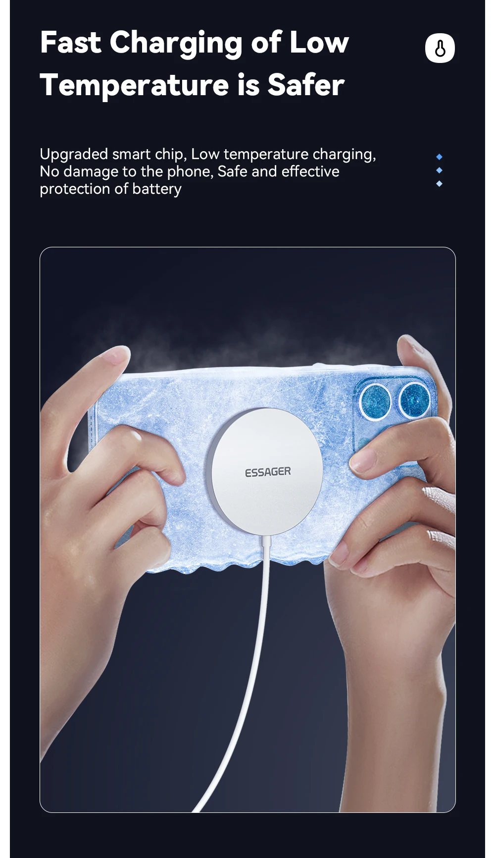 • Fast Wireless Charging :Experience rapid charging with the ESSAGER 15W magnetic Qi wireless charger. Designed for iPhone 14, 13, 12 Pro Max, and Xiaomi pad, it ensures your device is powered up in no time.