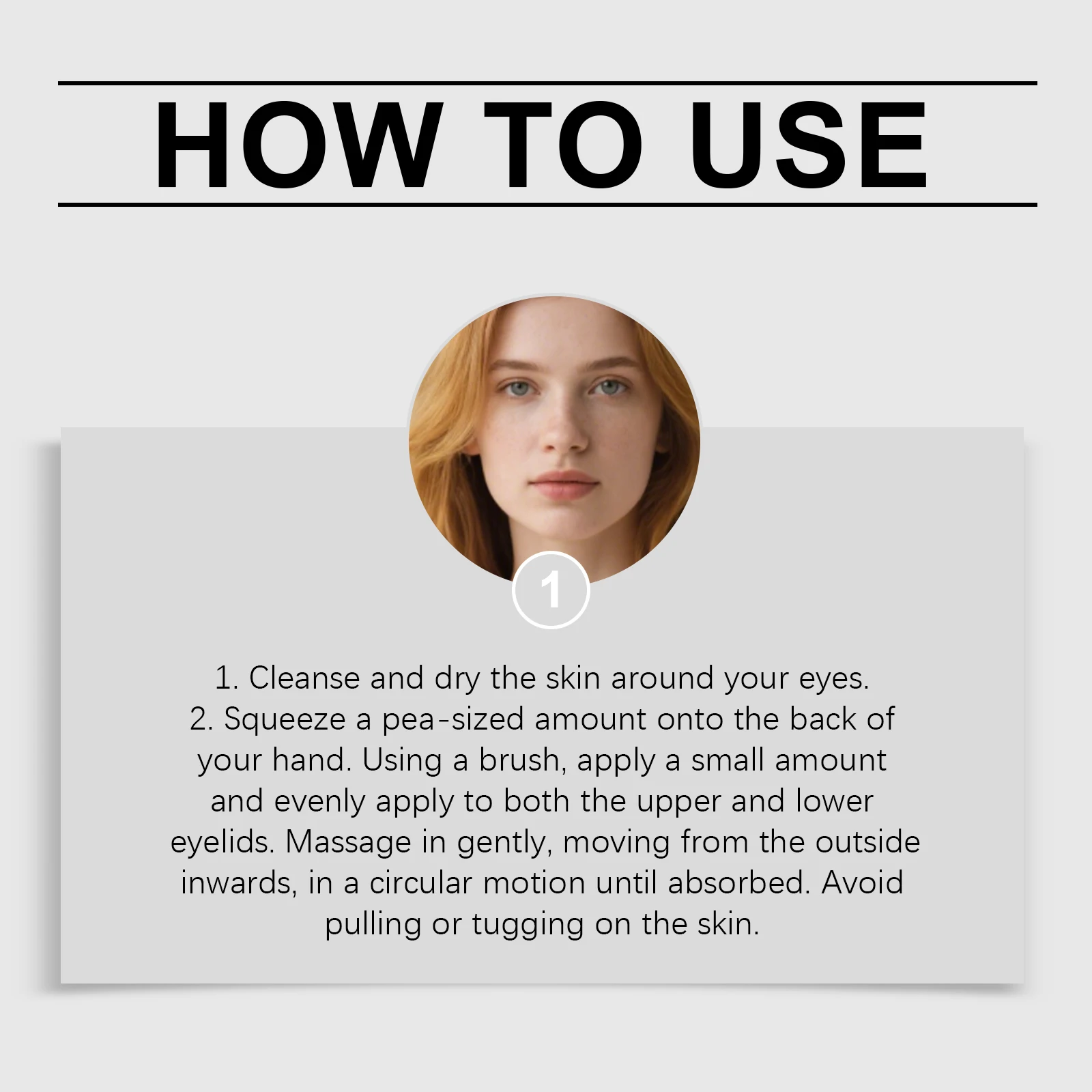 2. Squeeze a pea-sized amount onto the back of your hand. Using a brush, apply a small amount and evenly apply to both the upper and lower eyelids. Massage in gently, moving from the outside inwards, in a circular motion until absorbed. Avoid pulling or tugging on the skin.