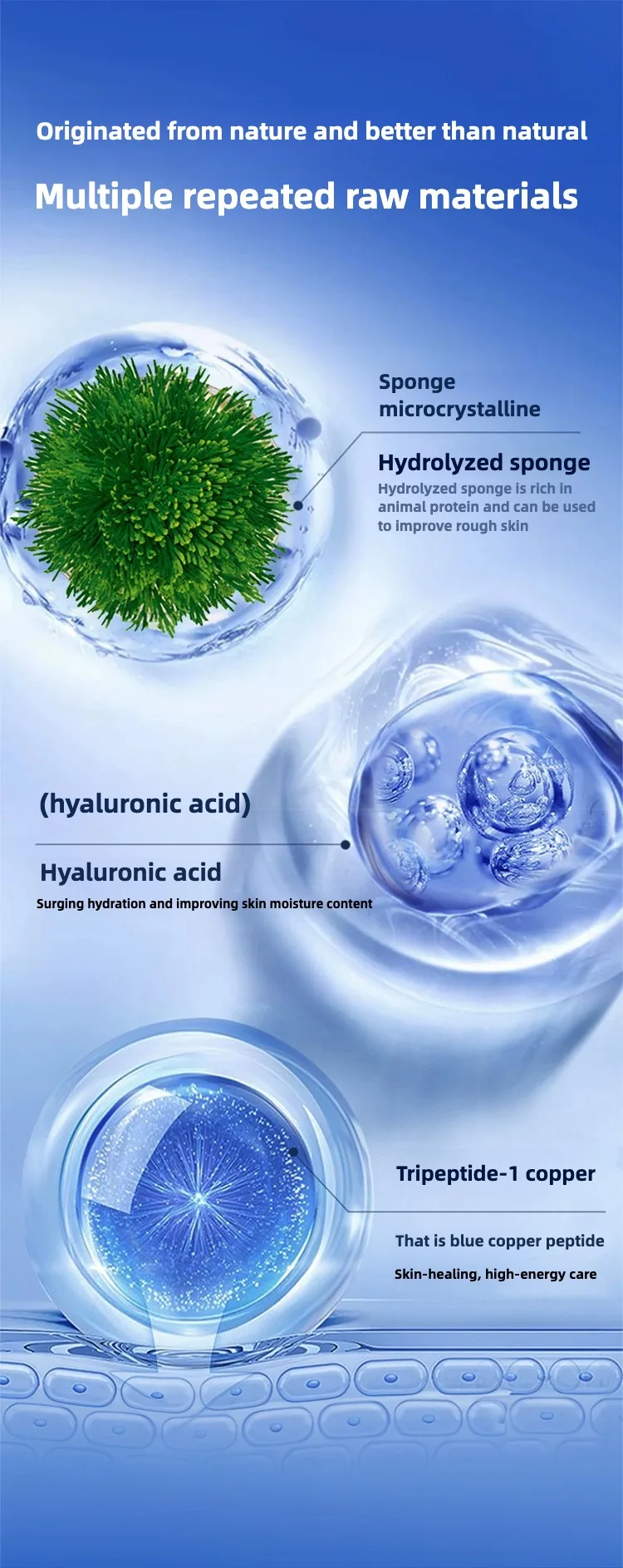 Cyanobacteria in the purest sea area of the deep sea contain precious hydrolyzed sponge components and blue copper peptide, which are extracted, purified and freeze-dried.