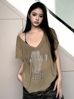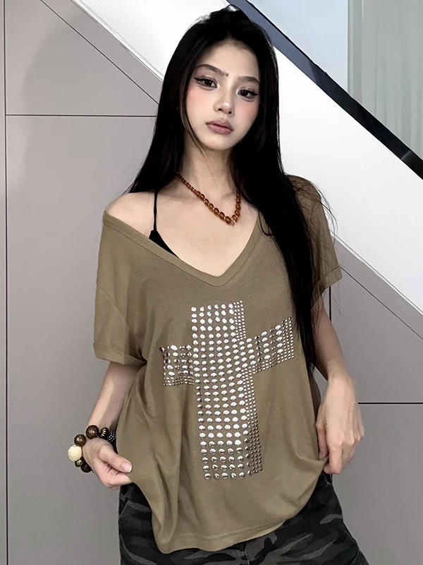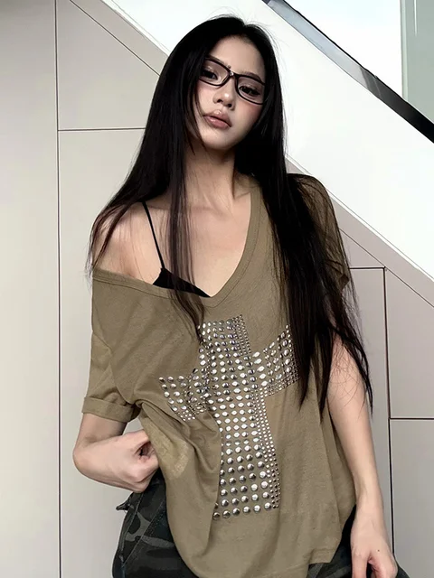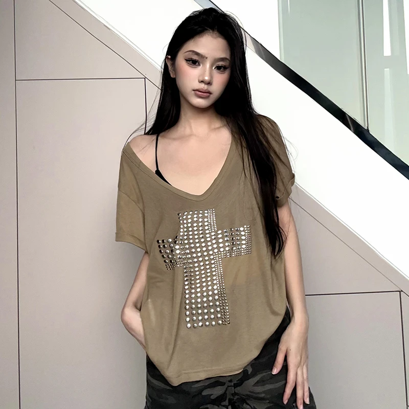 This T-shirt features a trendy ‘hot girl’ style with heavy beadwork and a V-neck, perfect for the fashion-forward lady.