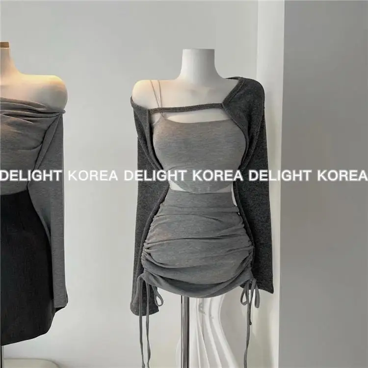 Fall Gentle Sle Women's 2023 New Korean Retro Aosphere Strap Top Dstring ort Skirt Tee-piece Set Commute Sle Lon...