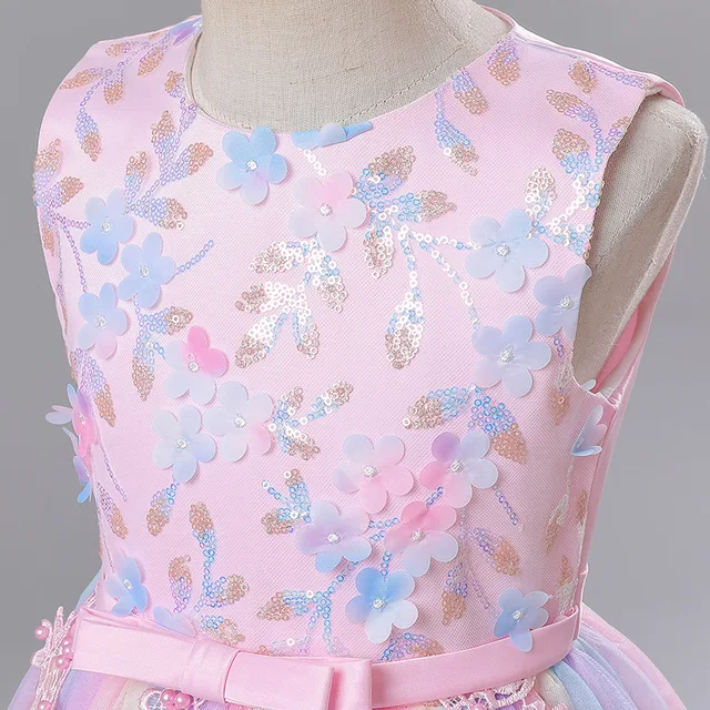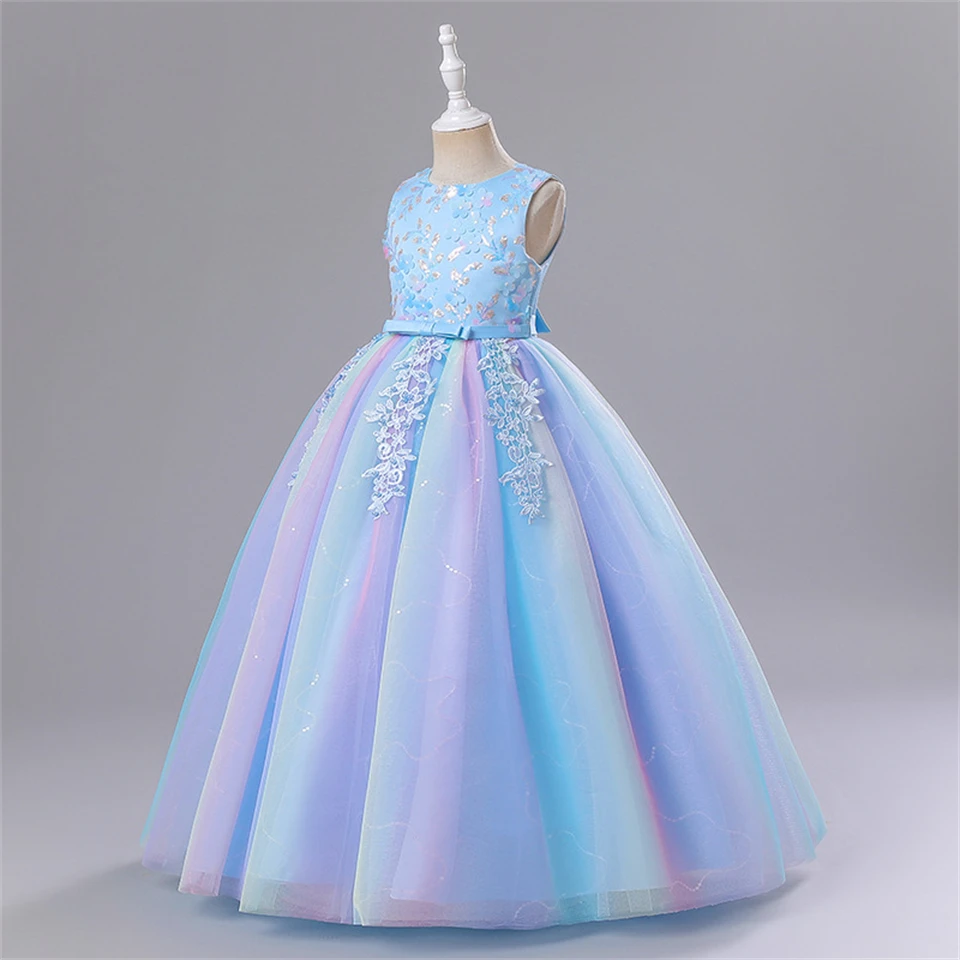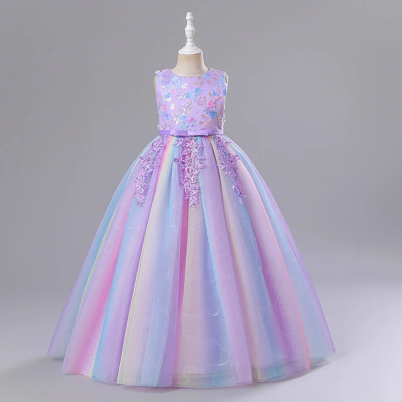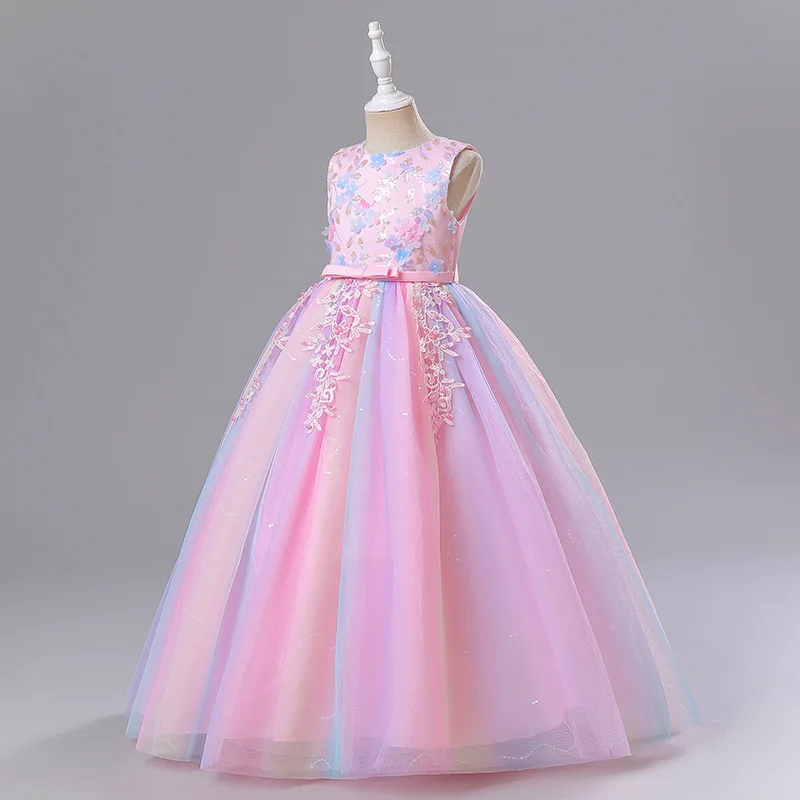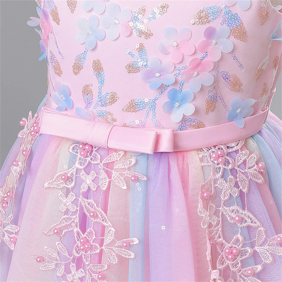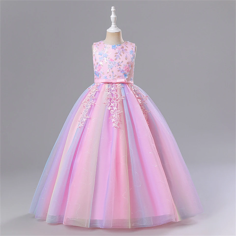 Fancy Girl Rainbow Tulle Embroidered Flower Dress Formal Occasion Children Graduation Wedding Bridesmaids Elegant Party Dresses