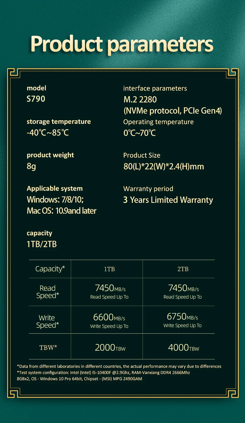 S790-2TB:Sequential Read Speed up to 7450 MB/s;Write Speed up to 6750 MB/s.Max to 4000TBW