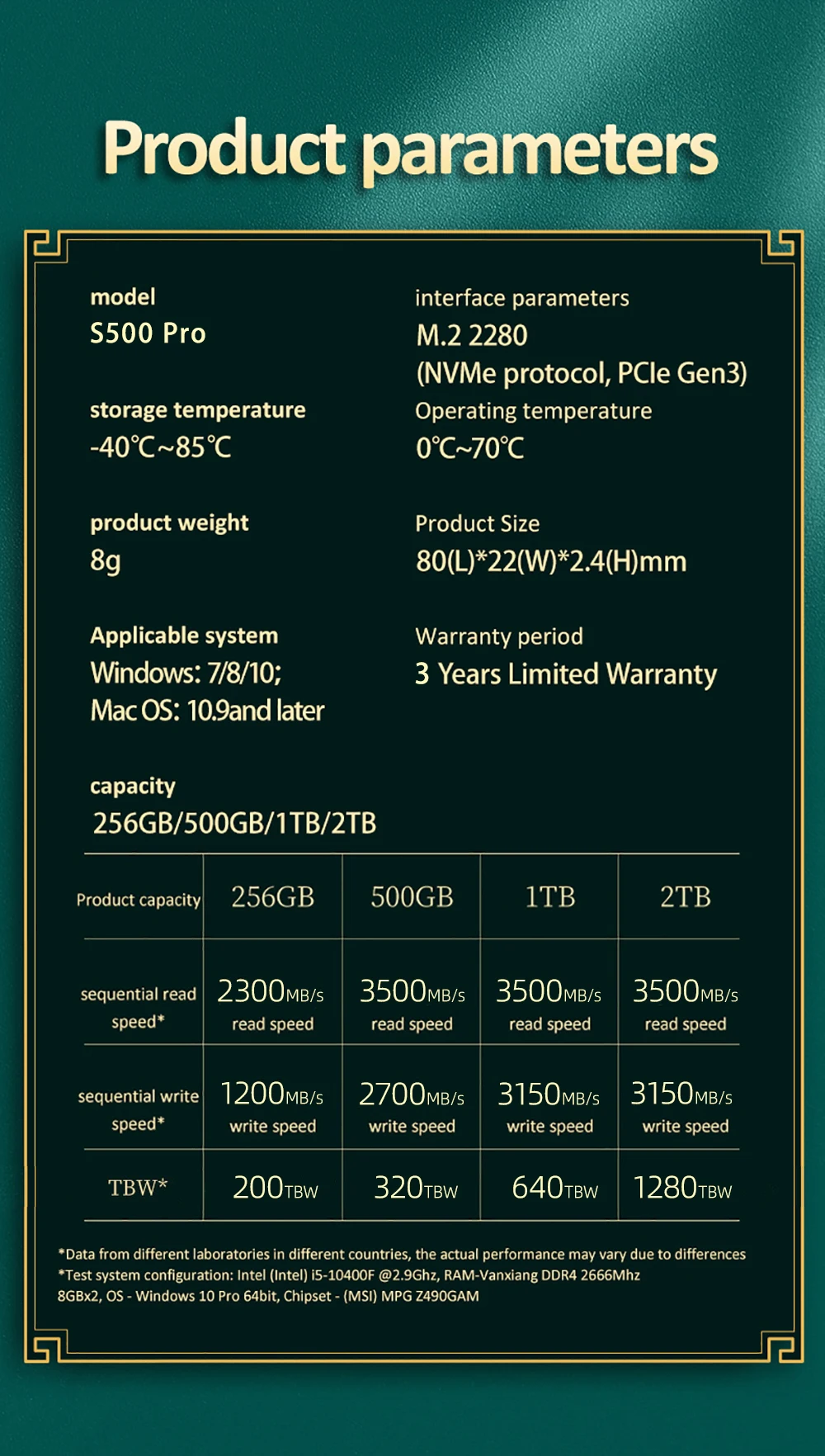 S500 Pro-1TB:Sequential Read Speed up to 3500 MB/s;Write Speed up to 3150 MB/s.Max to 640TBW