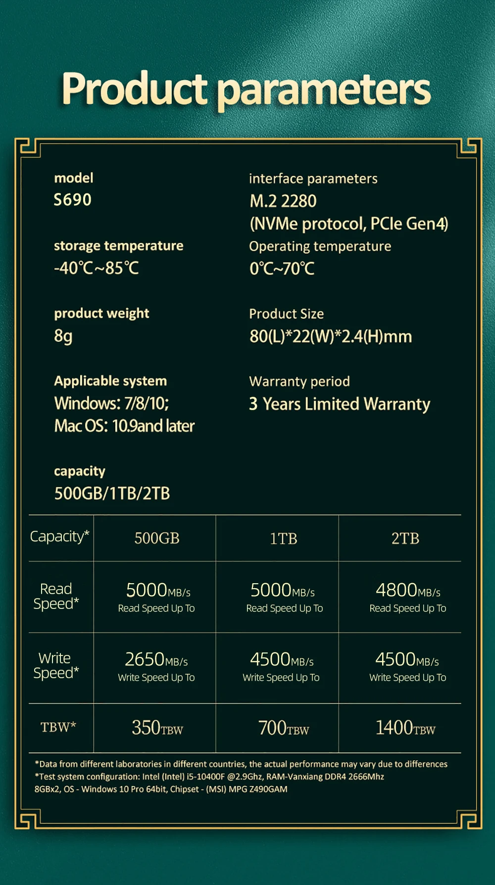 S690-1TB:Sequential Read Speed up to 5000 MB/s;Write Speed up to 4500 MB/s.Max to 700TBW