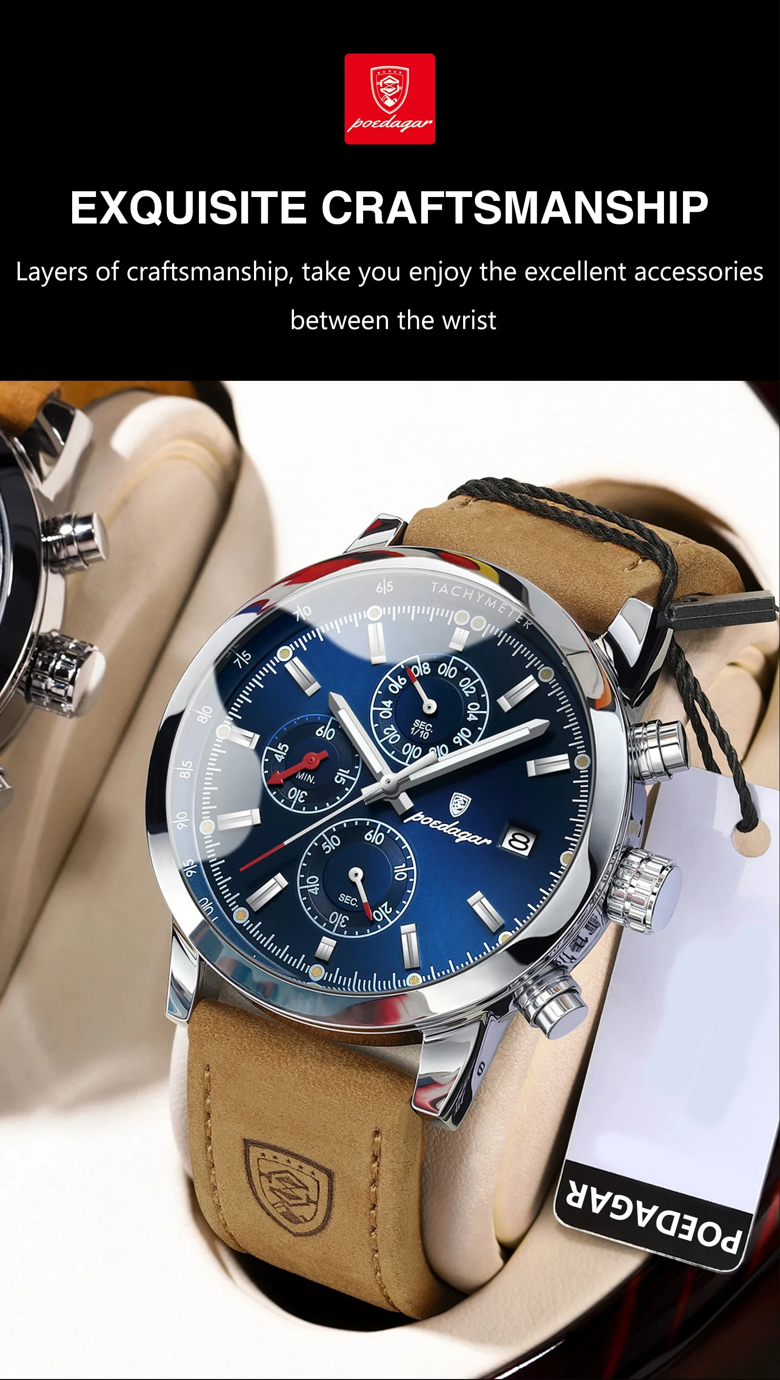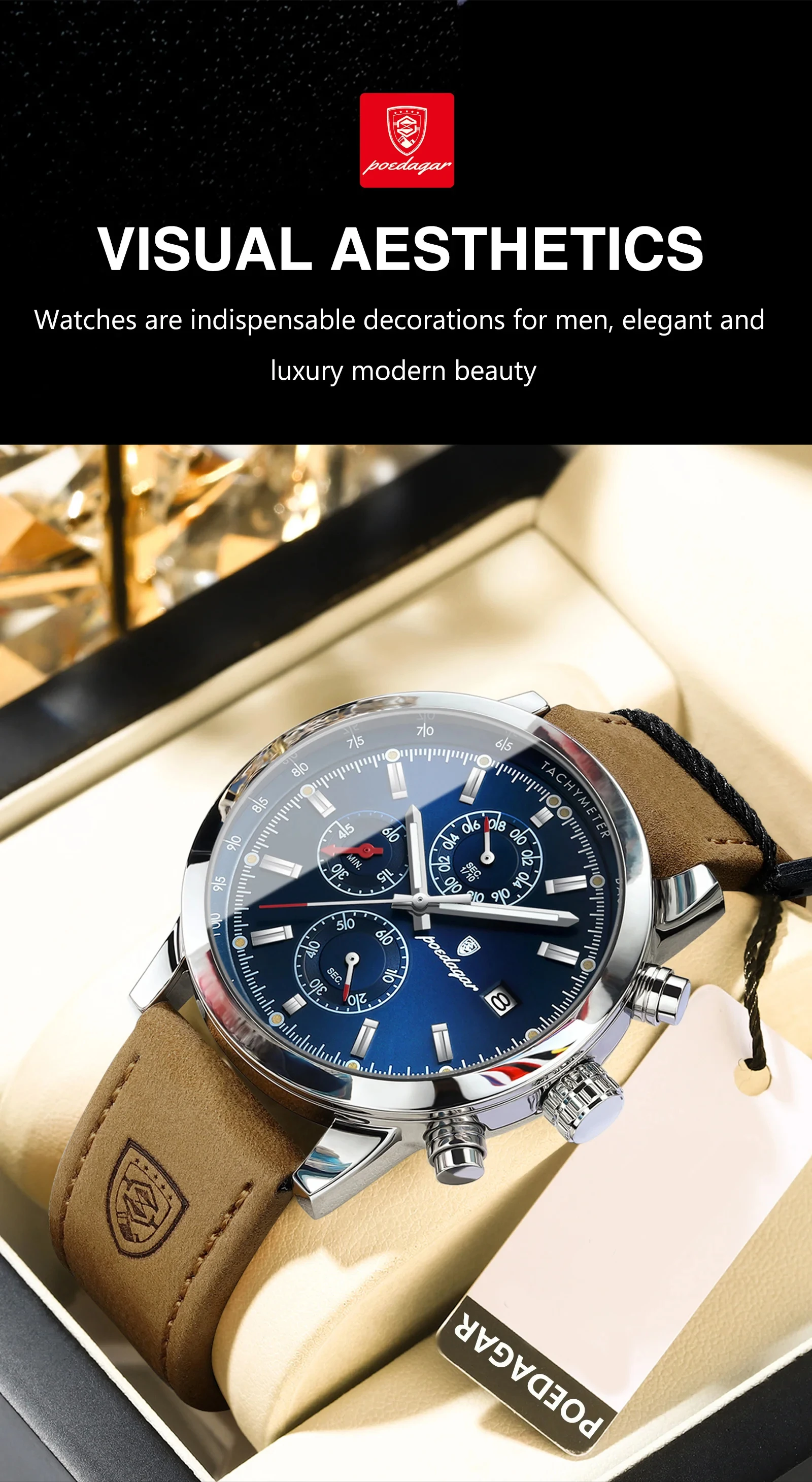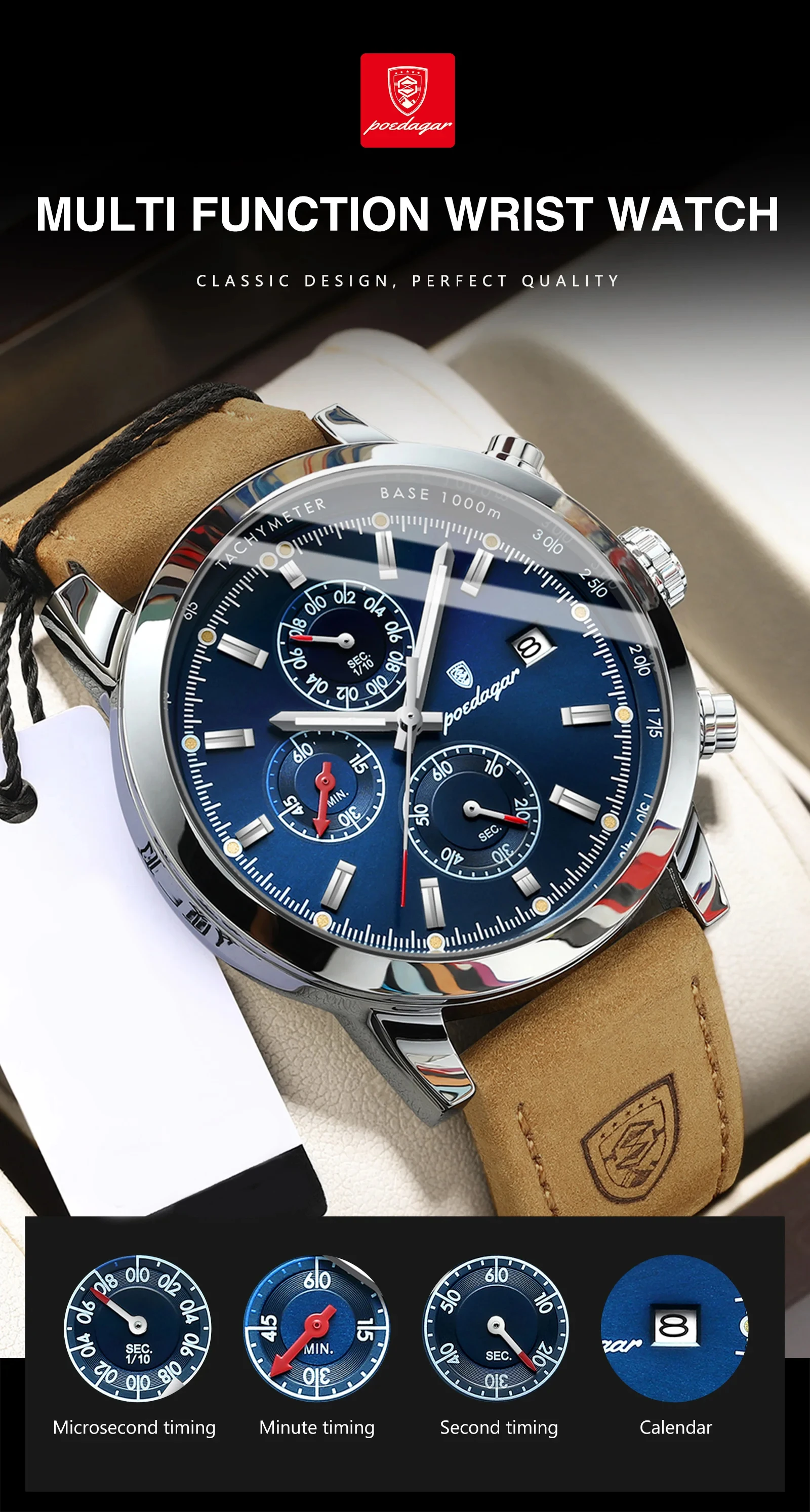 POEDAGAR Sports Casual Man Watch Date Waterproof Luminous Leather Chronograph Men's Watch Business Luxury Quartz Watches For Men