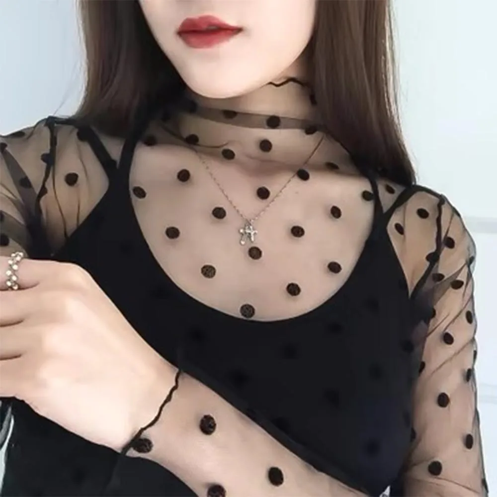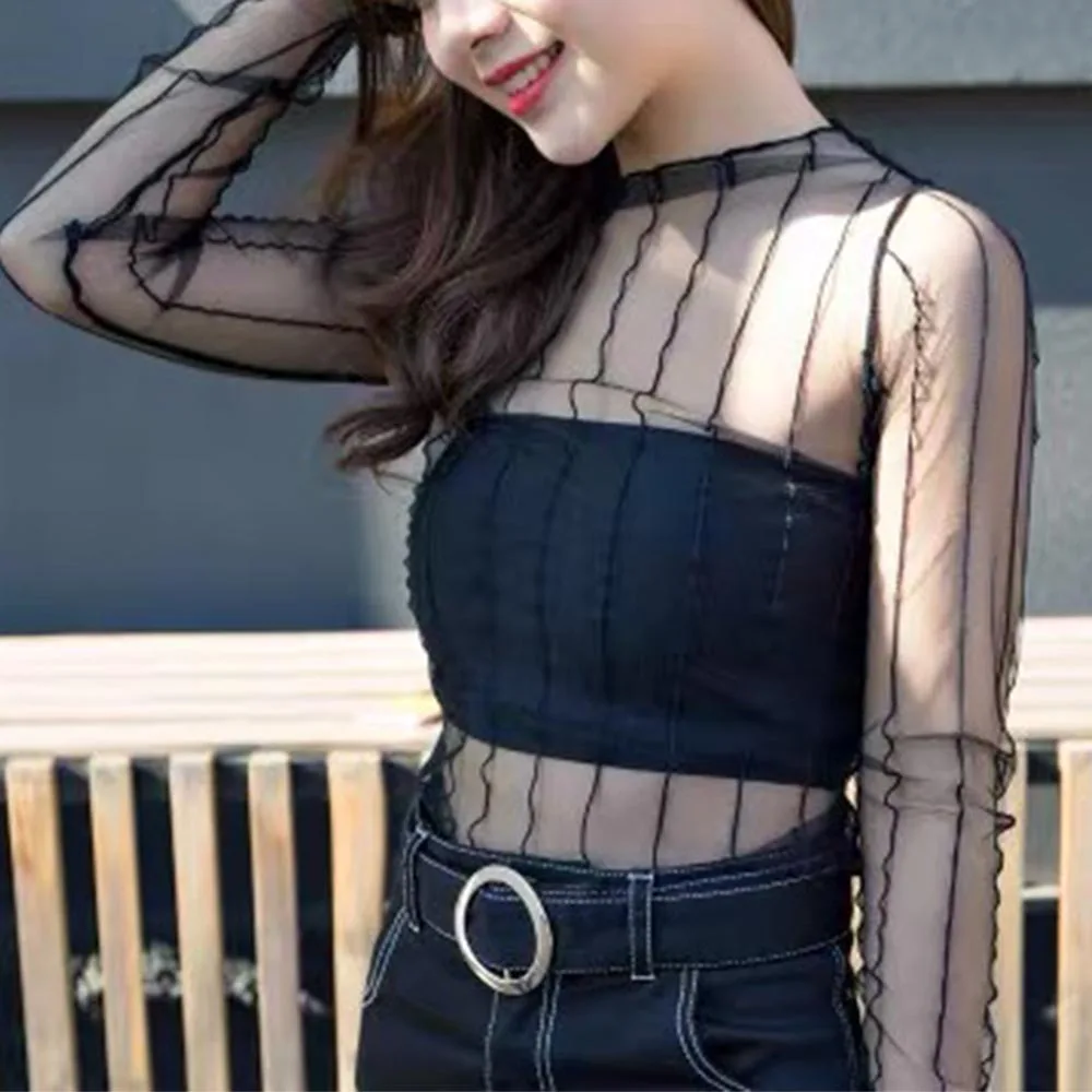 Women Fashion T-Shirts Mesh Sheer Party Long Sleeve Blouses T-Shirt Ladies Tops