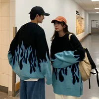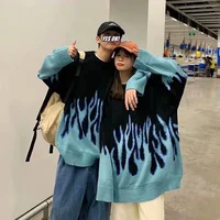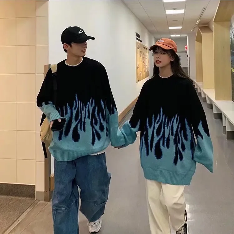 Fashionable American Hip Hop Loose Knitted Sweater Couple Outerwear Winter Men's Women's Crew Neck Flame Design Comfortable