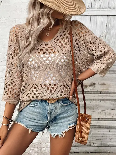 Fashionable and elegant large perforated top women’s hollow knitted sweater versatile sweater loose