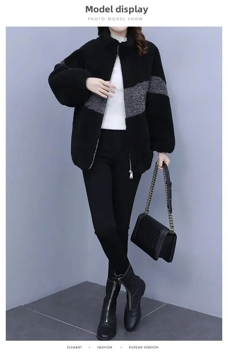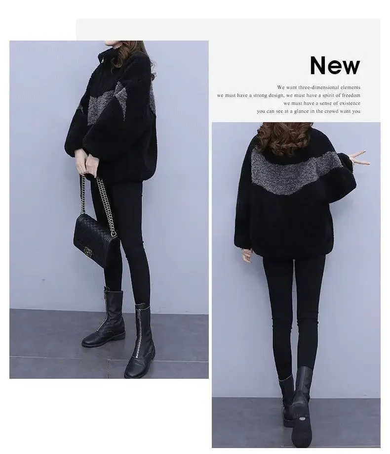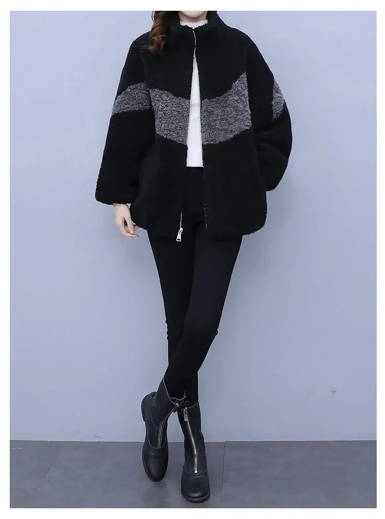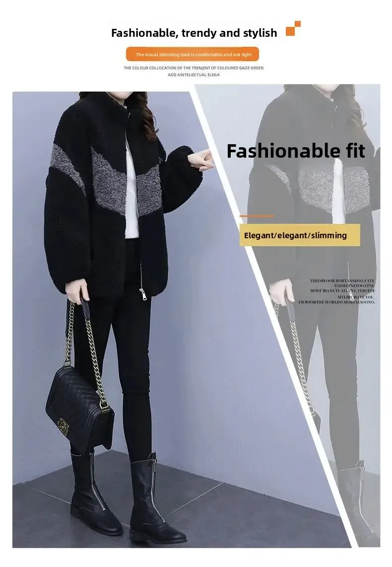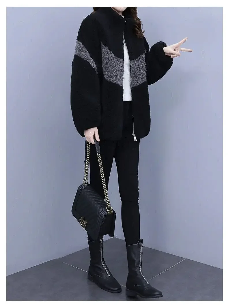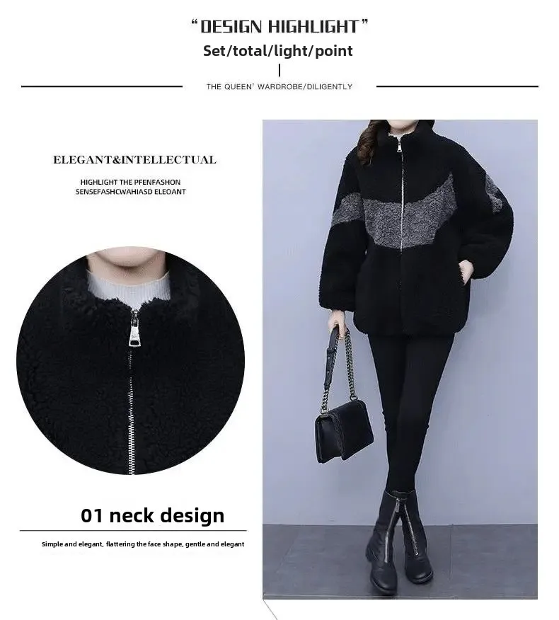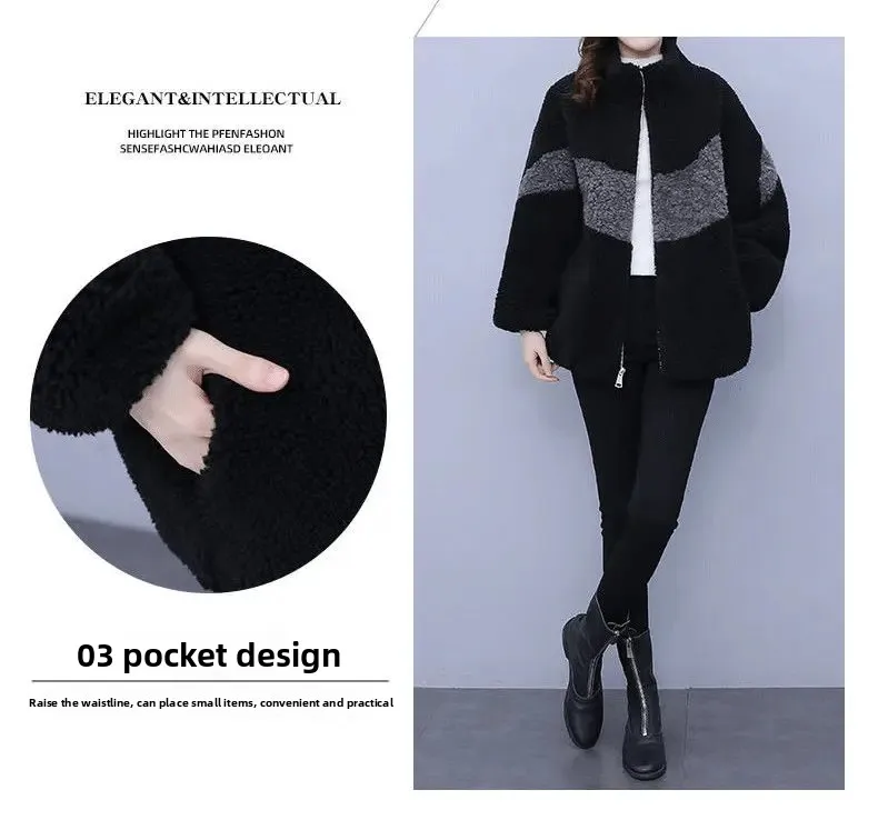 Fashionable Lamb Velvet Jacket Autumn Winter Thickened Loose Women’s Coat Color Block Particle