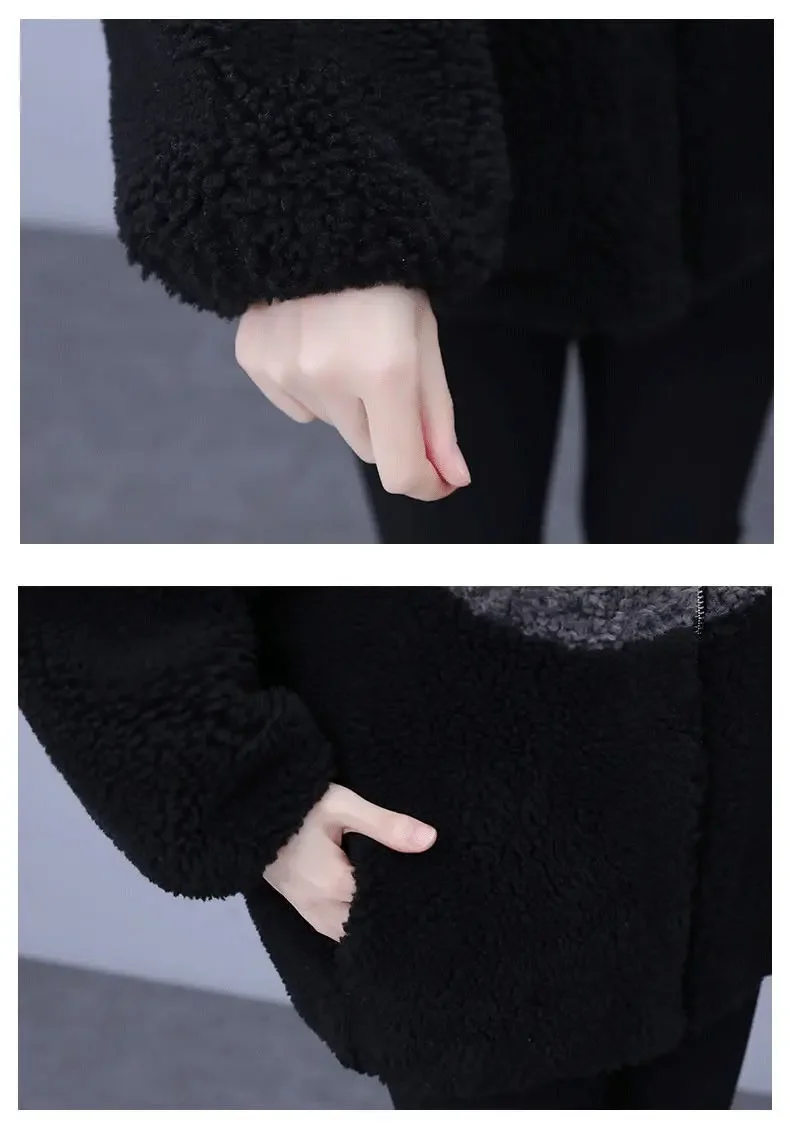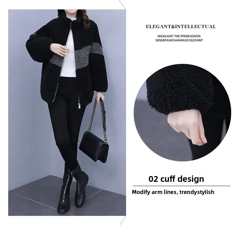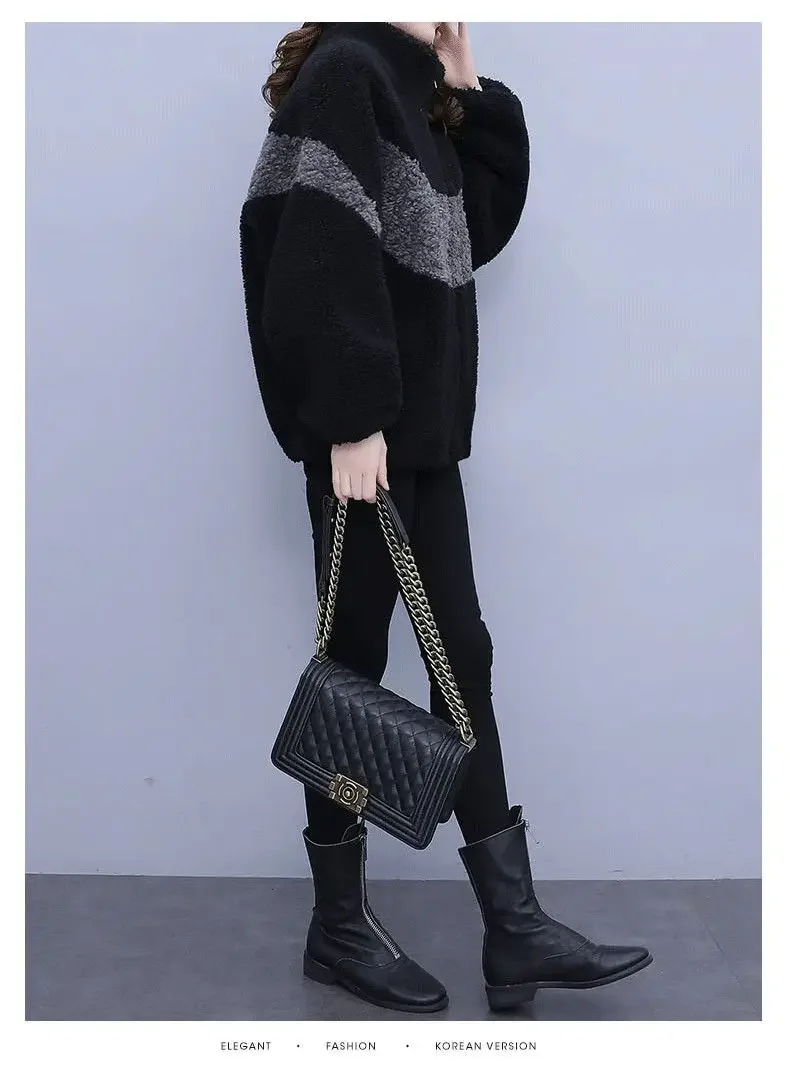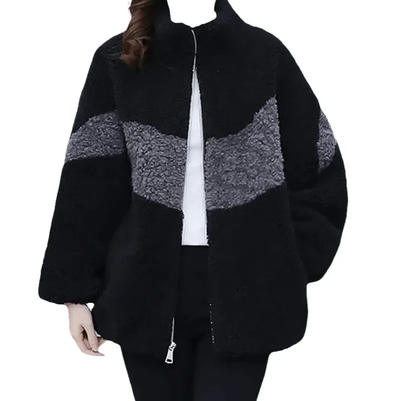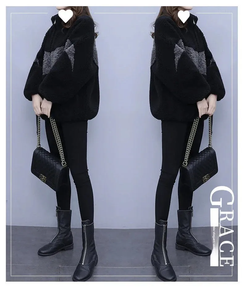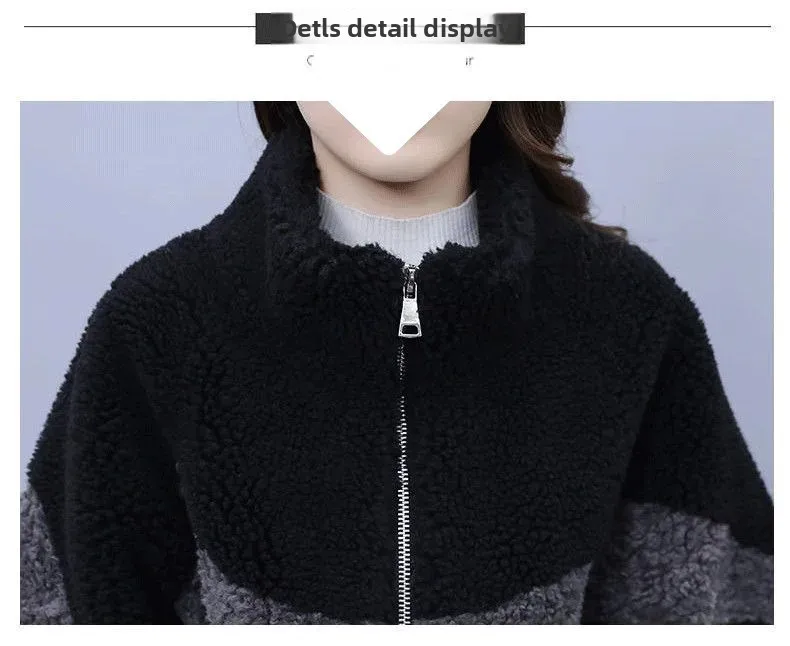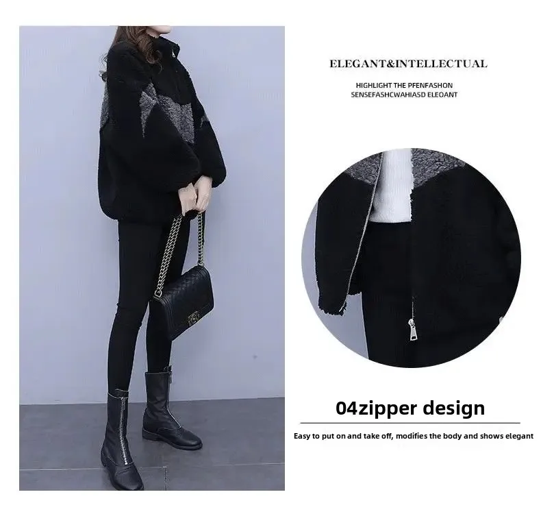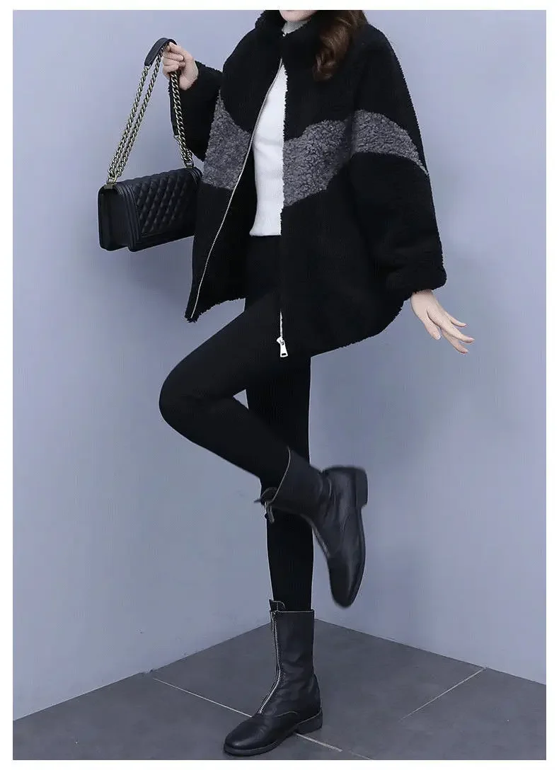 Fashionable Lamb Velvet Jacket Autumn Winter Thickened Loose Women’s Coat Color Block Particle