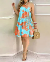 Floral Print Halter Neck Dress, Boho Backless Halter Dress
