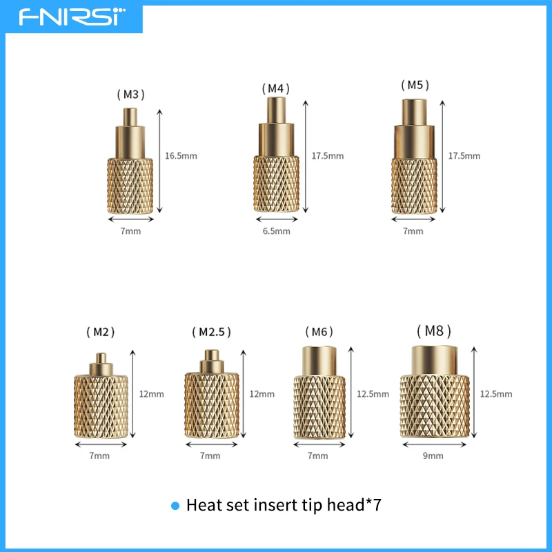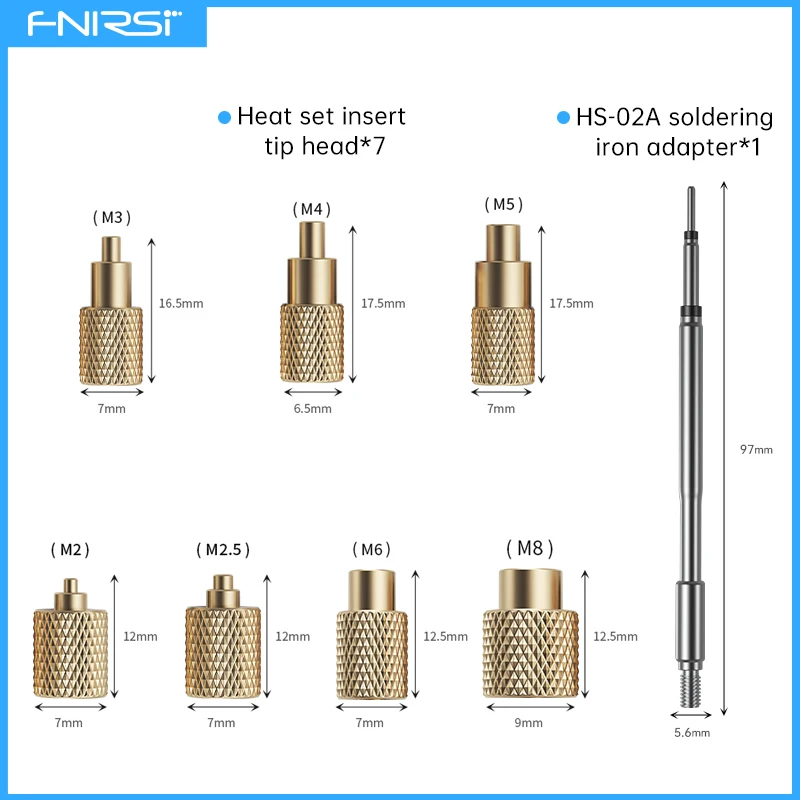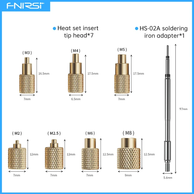 This kit includes soldering tips compatible with the HS-02A soldering pen and interchangeable with standard F245 universal soldering tips. It supports embedding hot melt nuts or inserts in sizes M2 (also suitable for M2.5), M3, M4, M5, M6, and M8. Commonly used for 3D-printed copper nuts or nut inserts in plastic components.