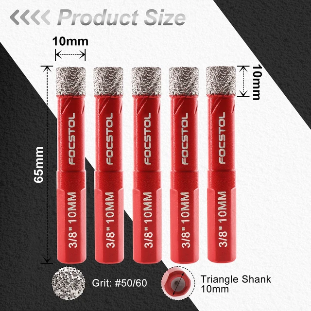 Core bits: Dia 6/8/10/12mm; total length 65mm; diamond height 10mm riangle shank