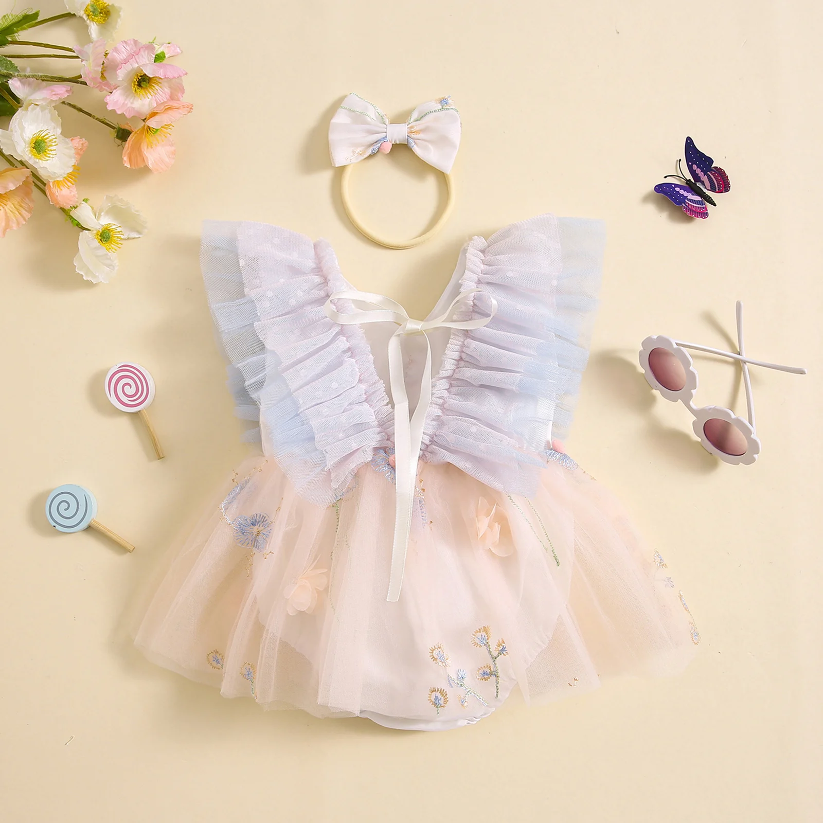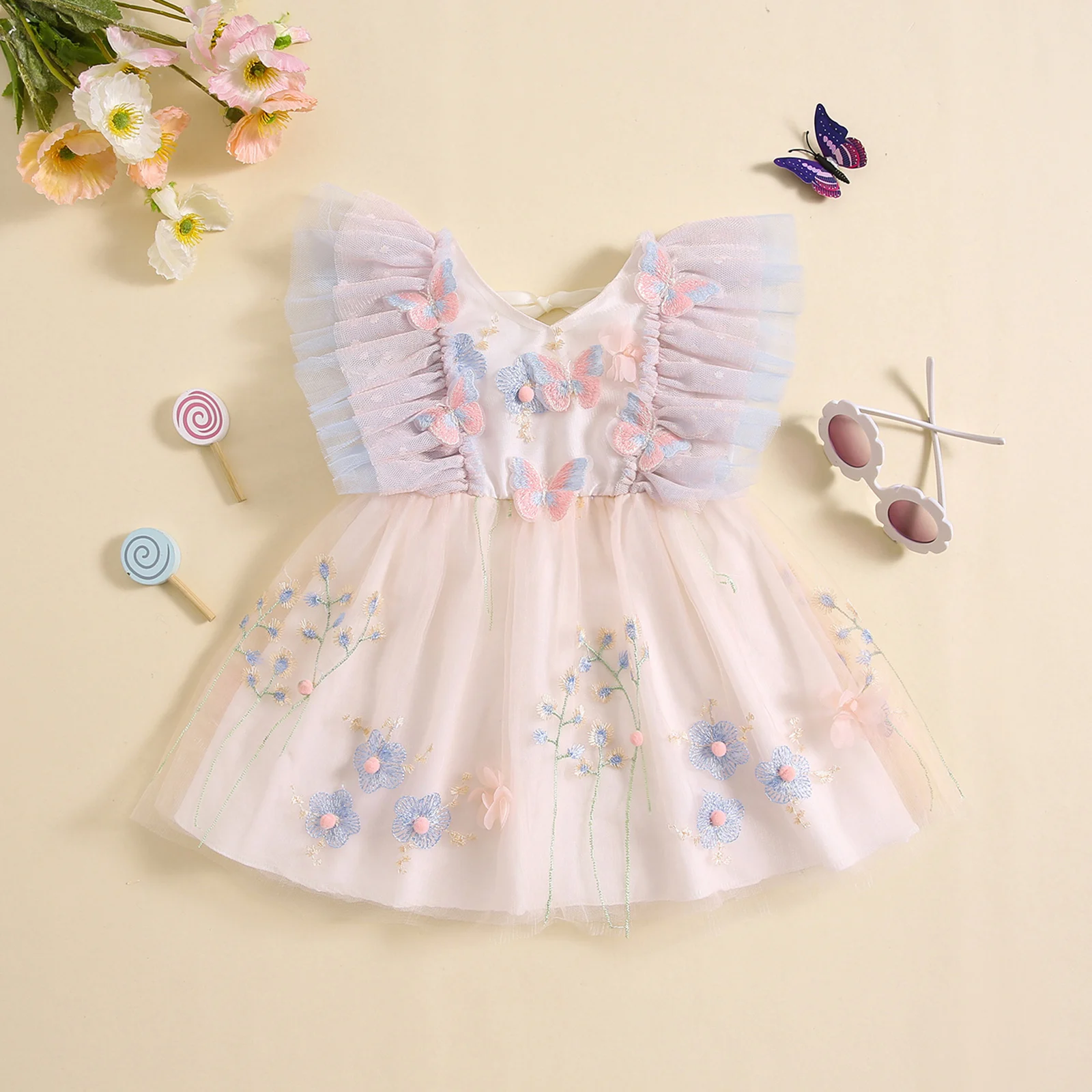 FOCUSNORM 0-5Y Toddler Baby Girls Romper/Dress Flower Butterfly Embroidery Fly Sleeve Mesh Tulle Dress/Jumpsuits
