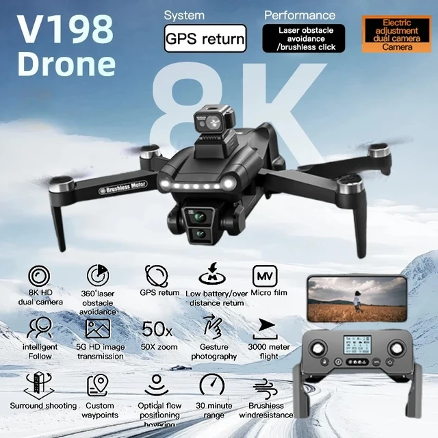 For Xiaomi V198 GPS Drone Professional HD Dual Camera 5G Wifi Photography Brushless Foldable Quadcopter RC Distance 8K Dron Toy