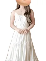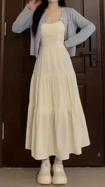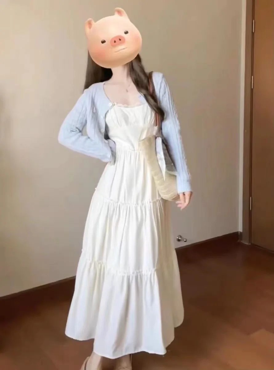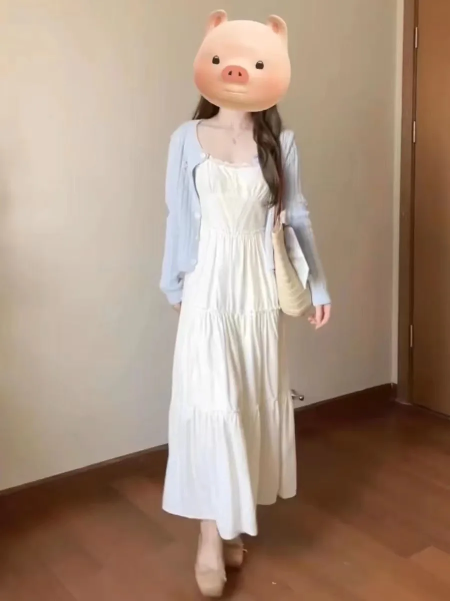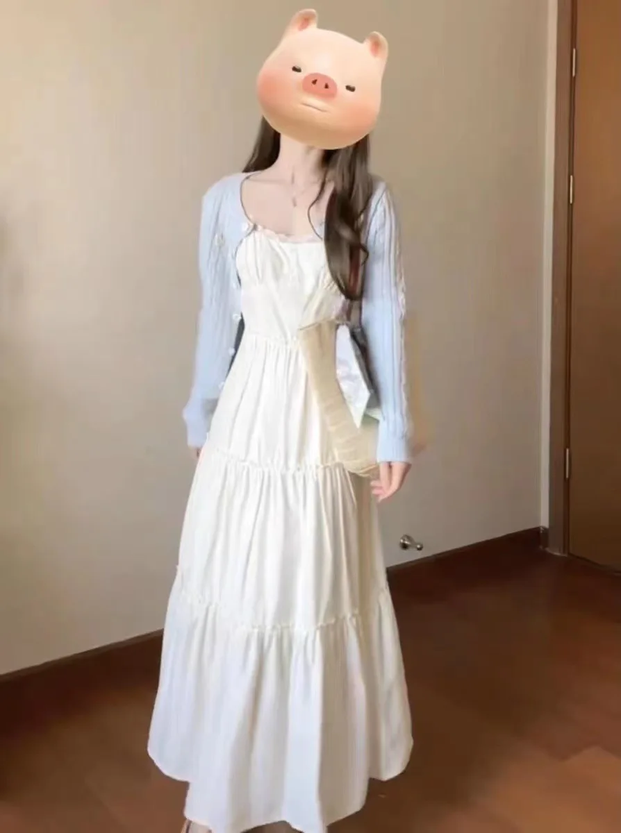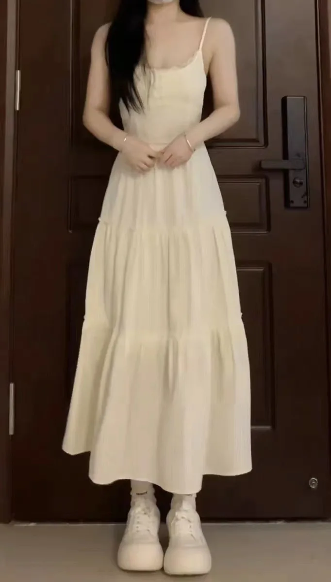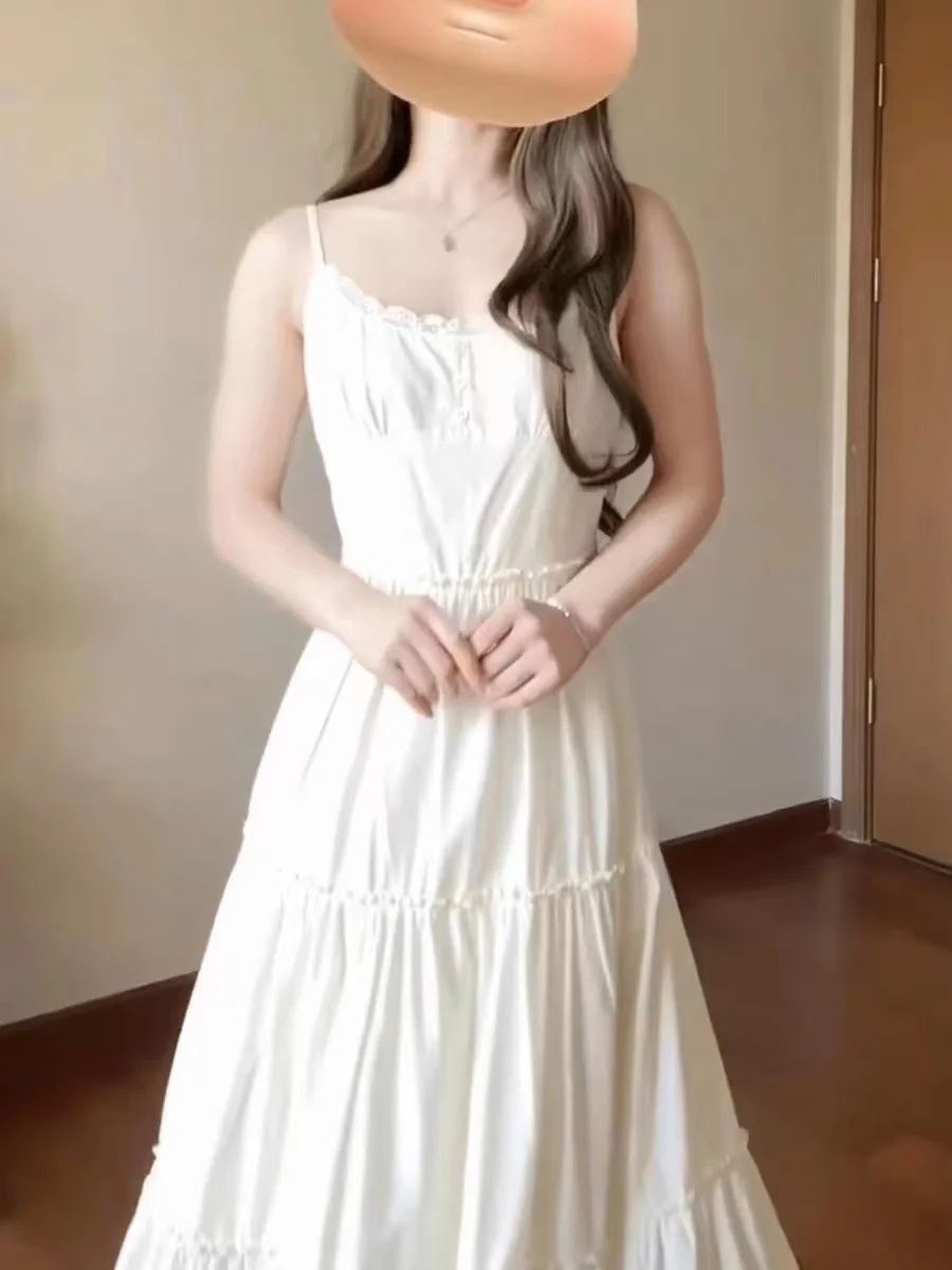 French Lace Strap Dress Women Slimming Pure Sweet Milk Style White Waist Cinched Long Dress Original Version with Inner
