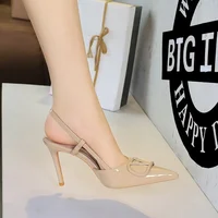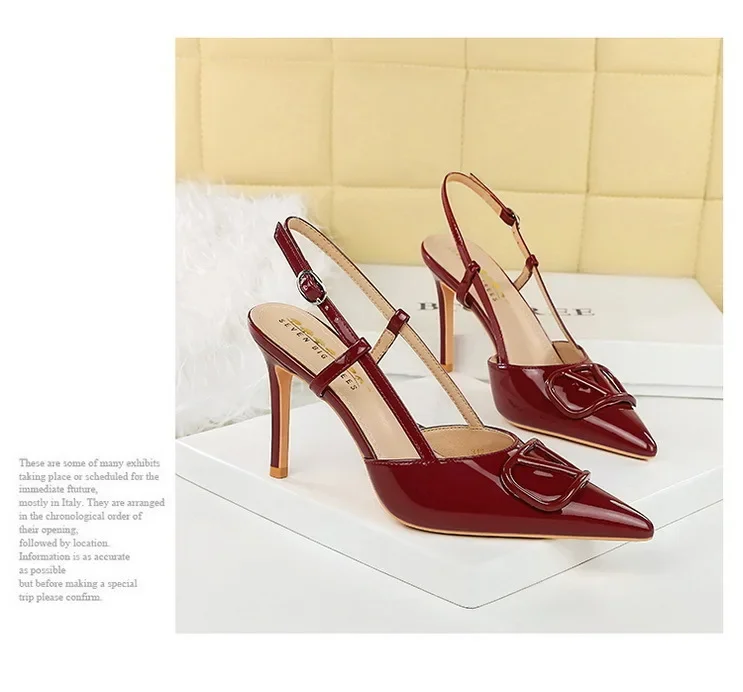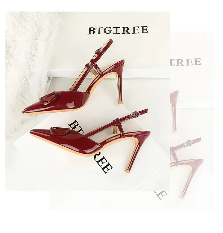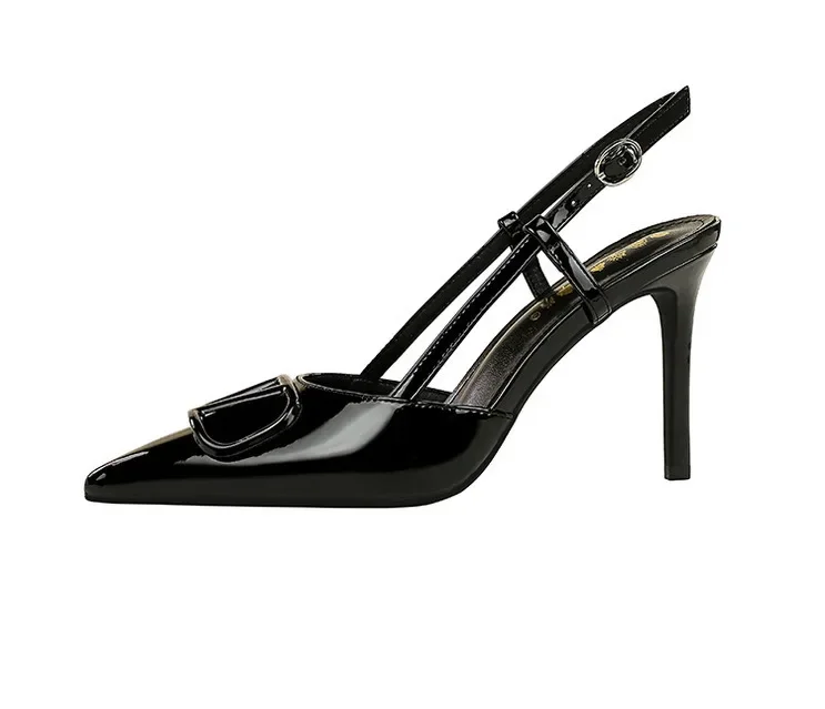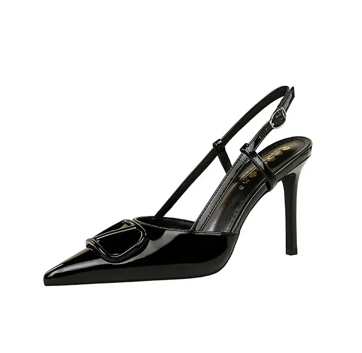 French Sexy V-Notch Square Buckle Pointed Toe High Heels Women's Thin Heel Patent Leather Backless Strap Single Shoes