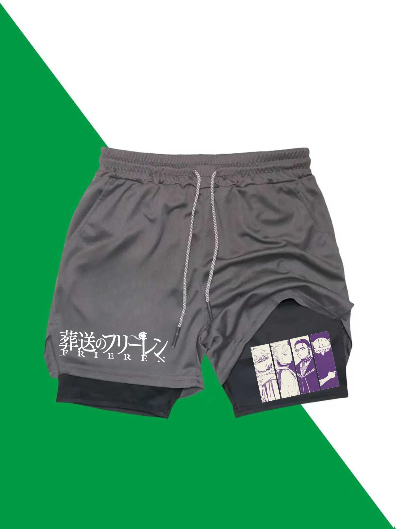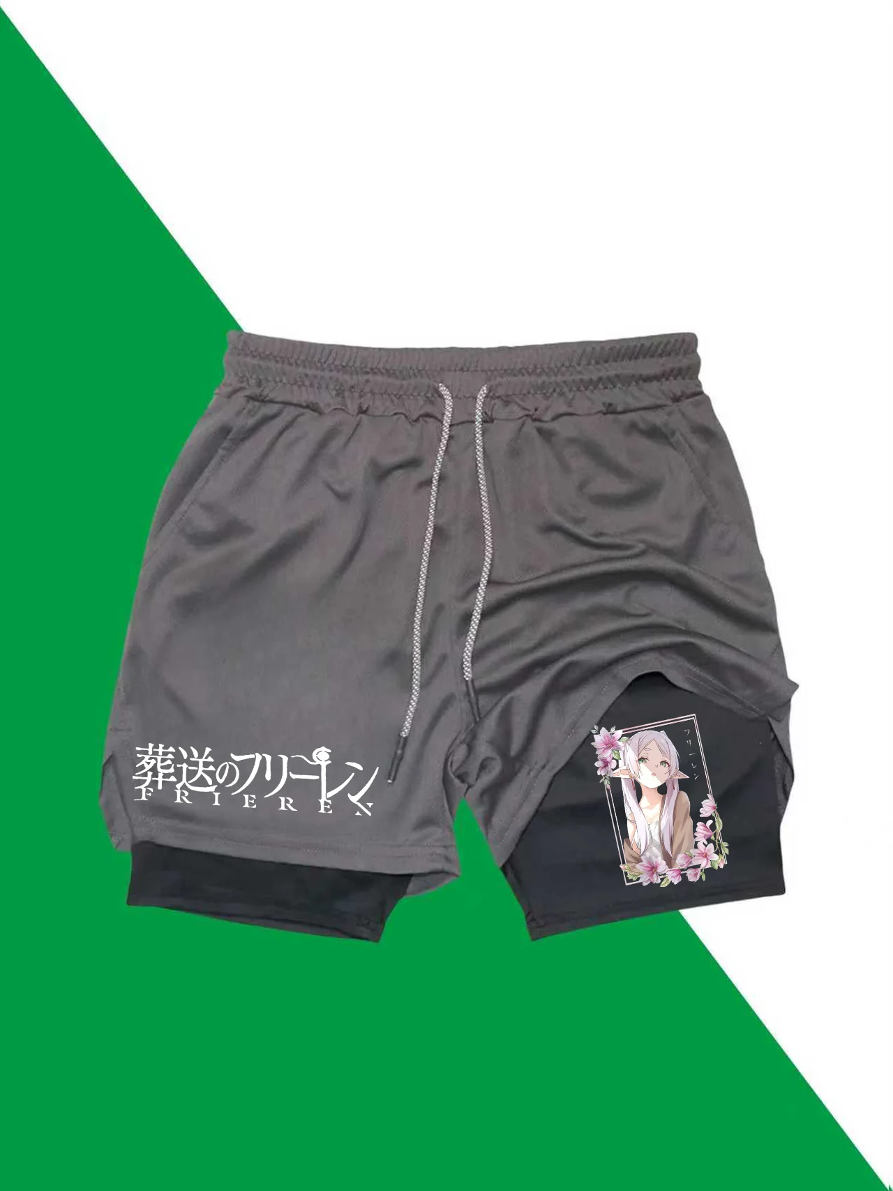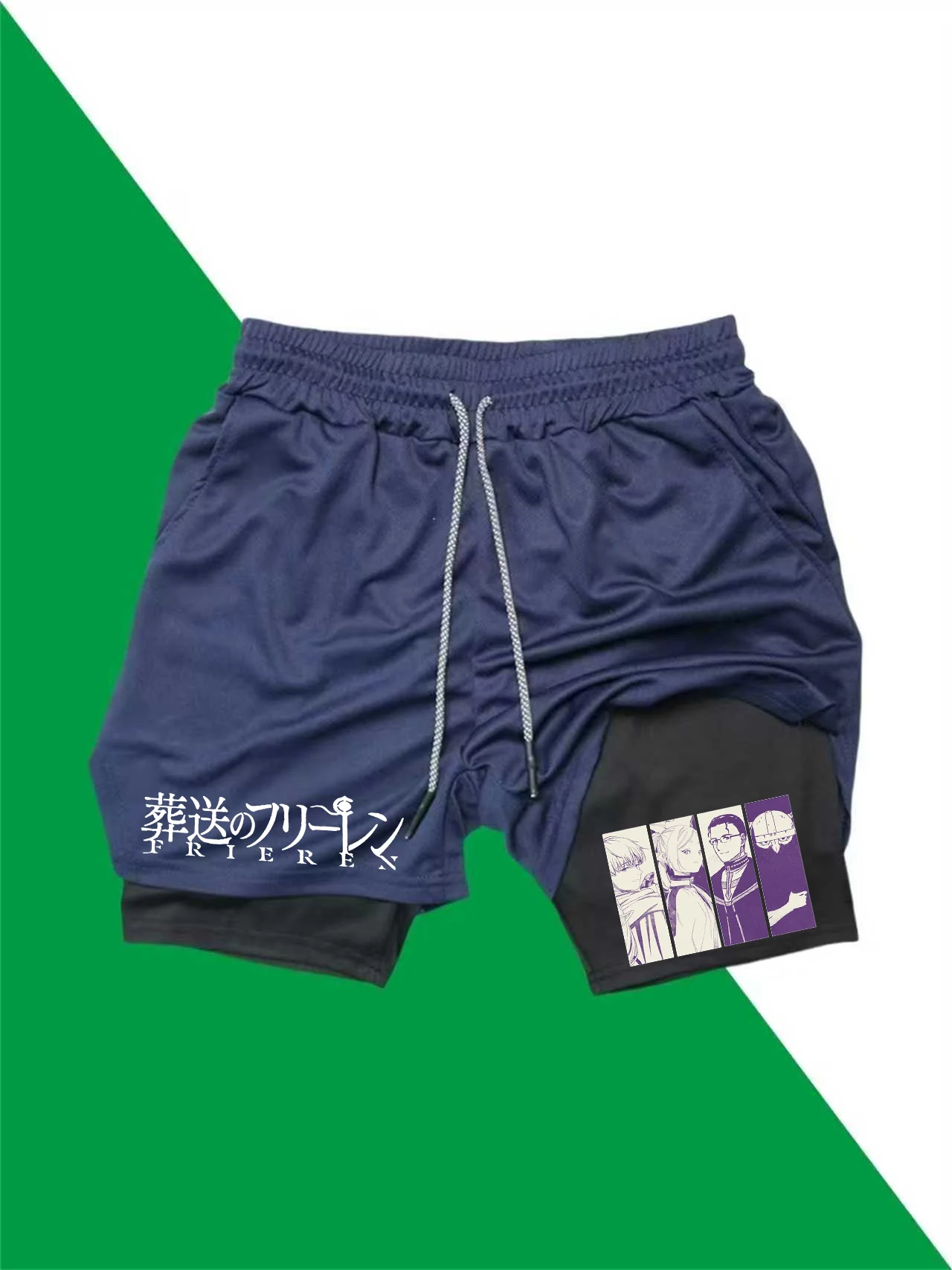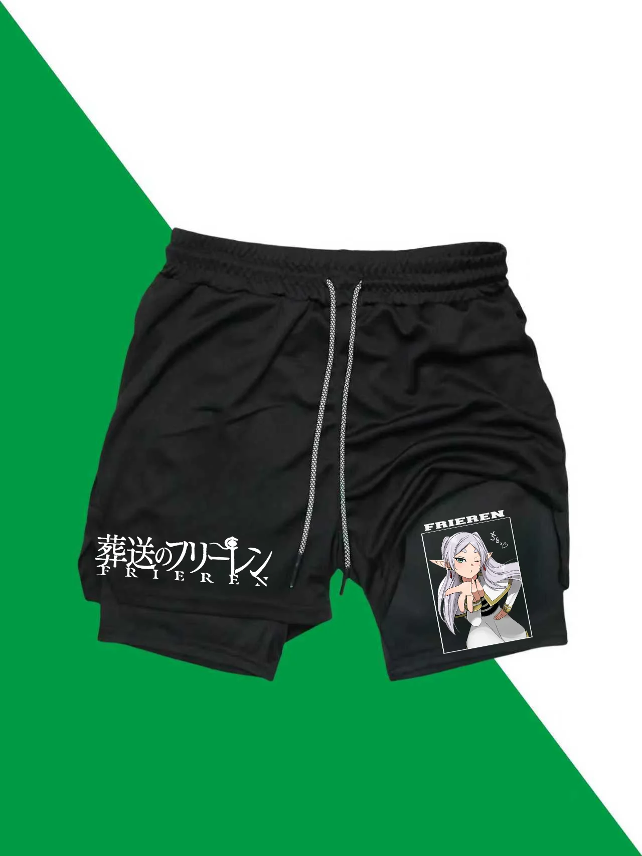 Frieren Print 2-in-1 Running Workout Shorts Men Gym Performance Compression Shorts with Phone Pocket