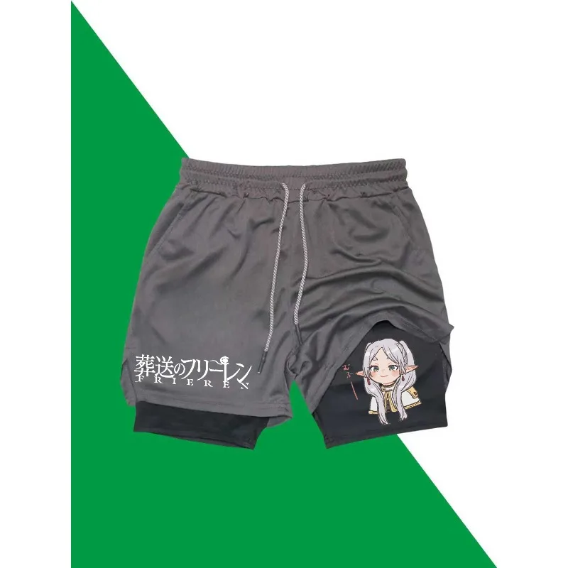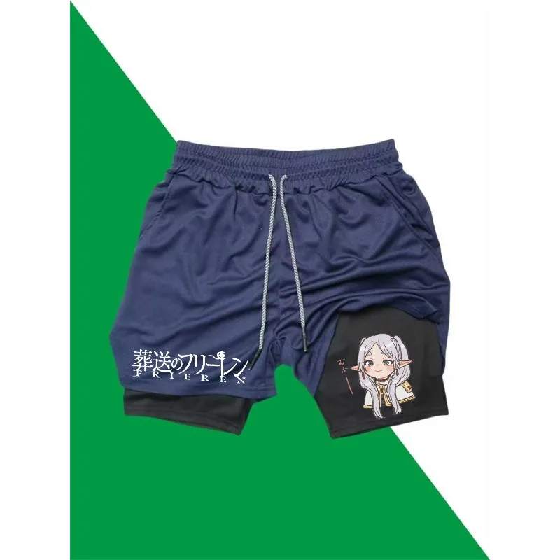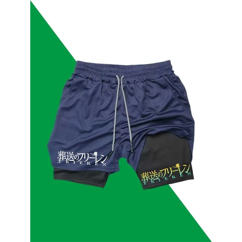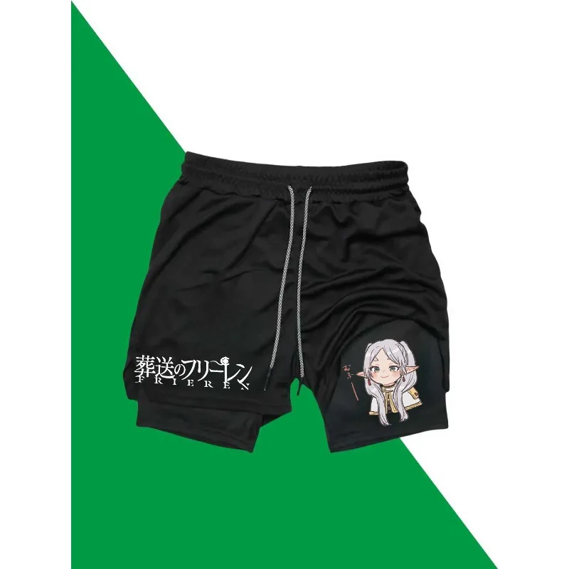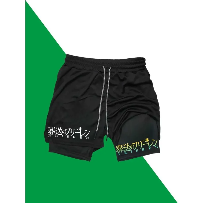 FrierenPrint 2in1 Running Workout Shorts Men Gym Performance Compression Shorts with Phone Pocket Towel