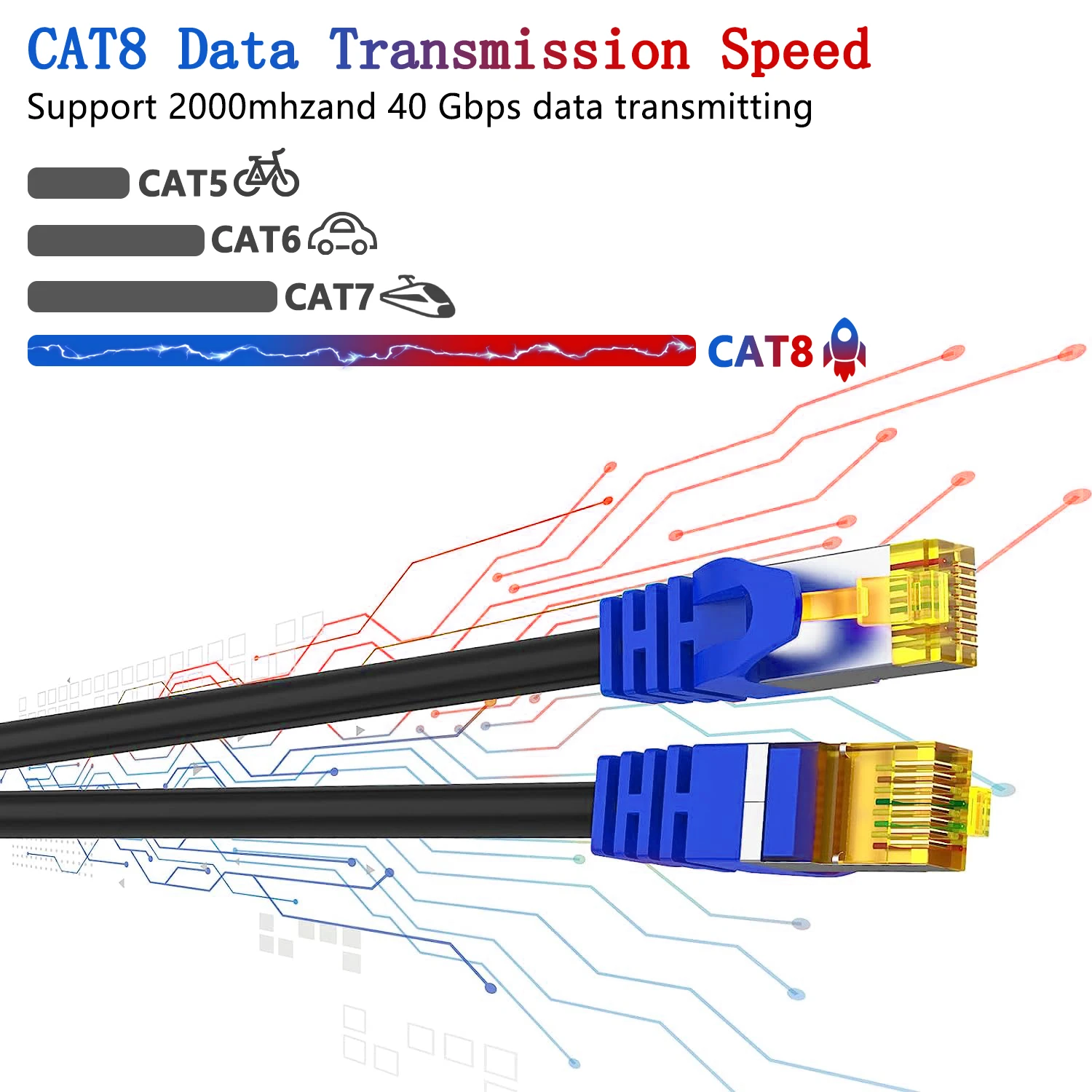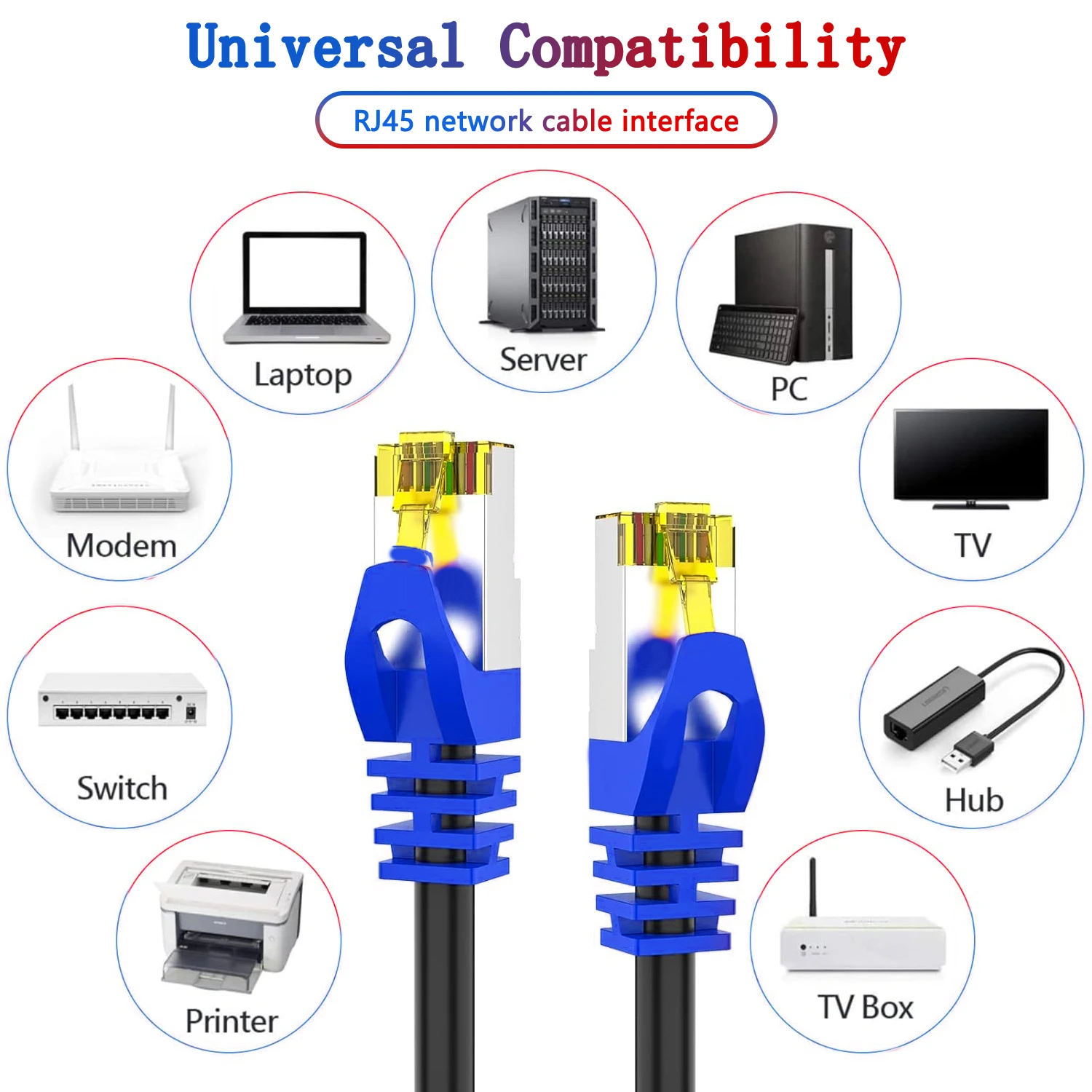 High Speed Cat 8 Ethernet Cable constructed with the RJ45 connector makes it perfects for Servers, TV, TV Box, Laptop, PC, Printer, Networking switch, Routers, ADSL, Adapters, Hubs, Modems, PS3, PS4, PS5, X-box, Patch panels and other high performance networking applications.
