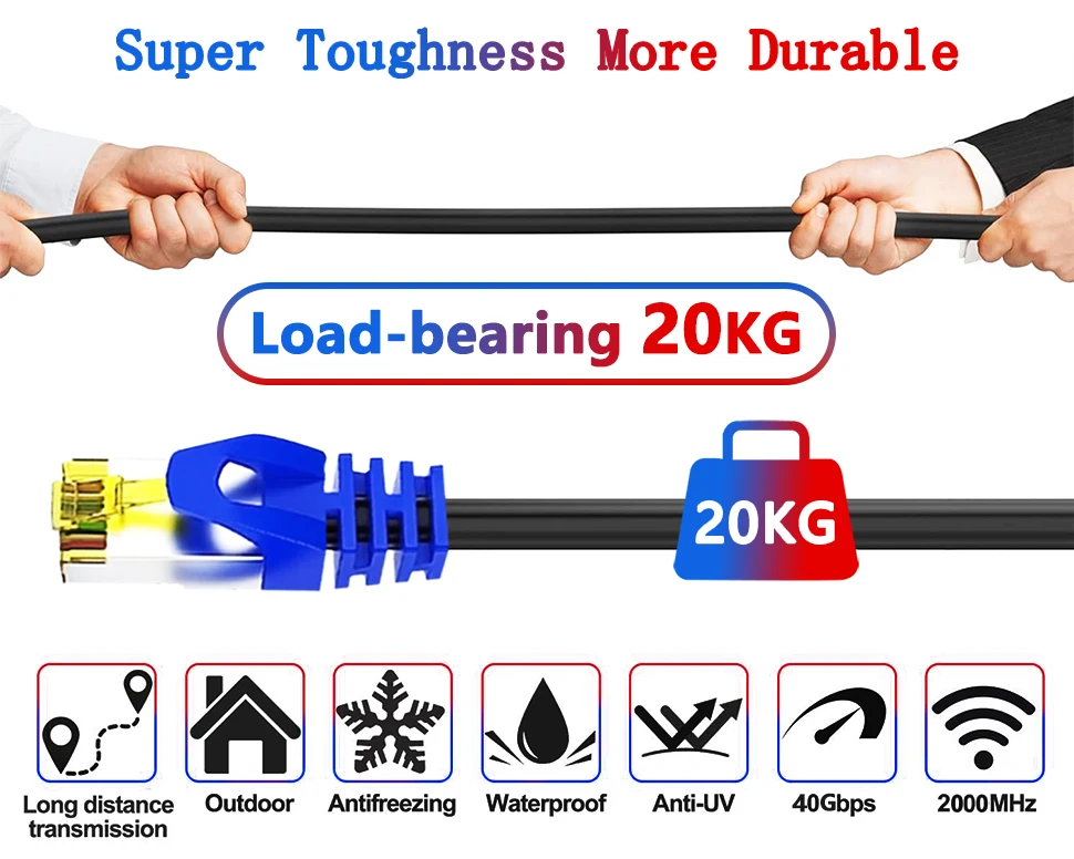 Heavy duty Cat 8 cable, comply with Cat8 26AWG standard completely, 6.3mm diameter thick and rounded design; Wrapped by environmental 0.8mm thicker outer PVC, more durable, flexible without any fear of breaking, anti-aging.