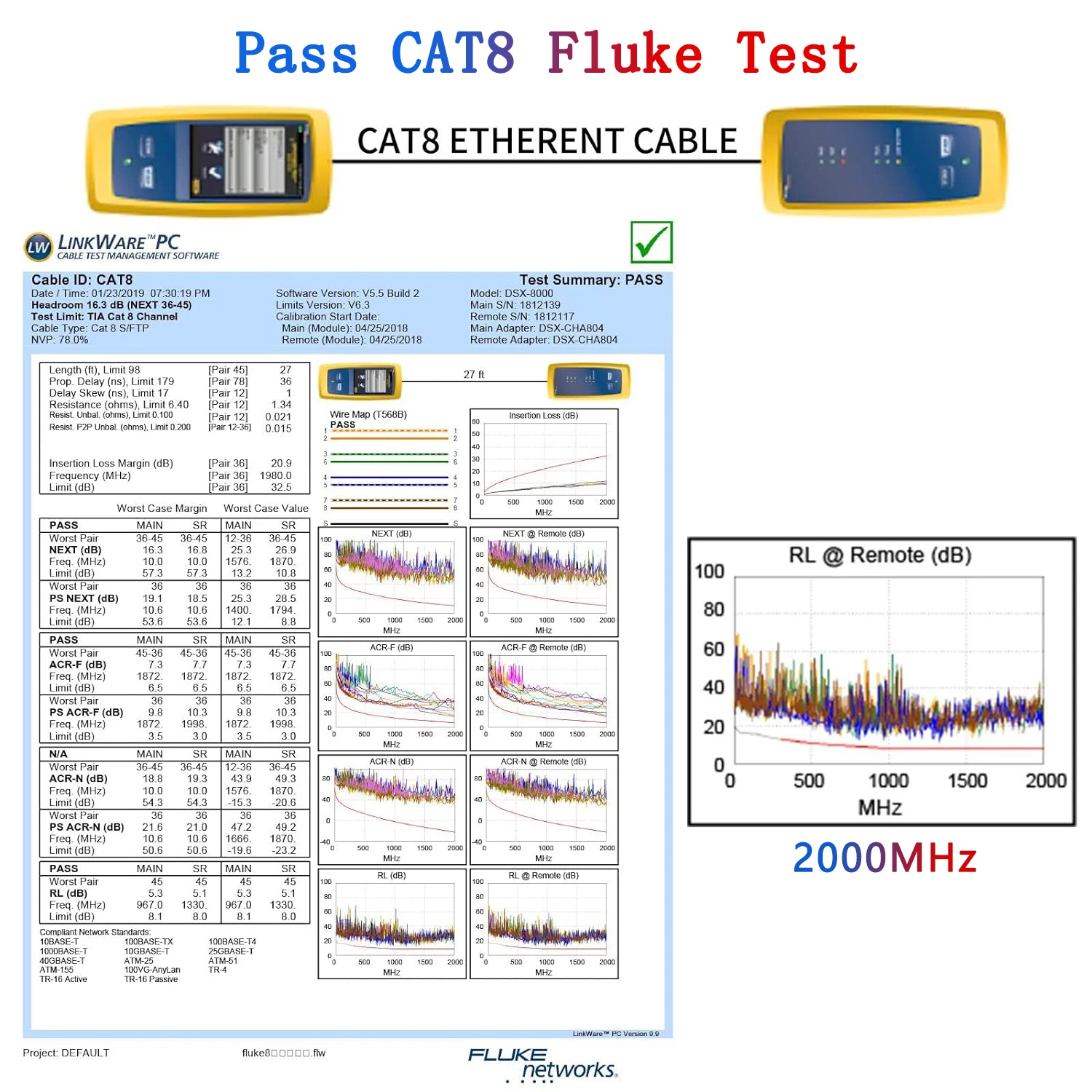 Tested with Fluke professional Cable Analyzers and all our Cat8 cables are individually certified under strict industrial standards (TIA 10G Patch Cord or Channel). The certification include near end cross talk, return loss, prorogation delay, skew delay and so on.