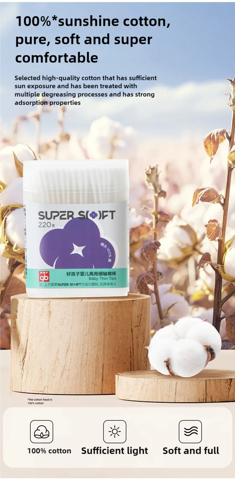 gb Cotton Swabs, , 220 Count, Double Head, for Hygiene and Beauty Care, Original Cotton Swab, Made with 100% Cotton