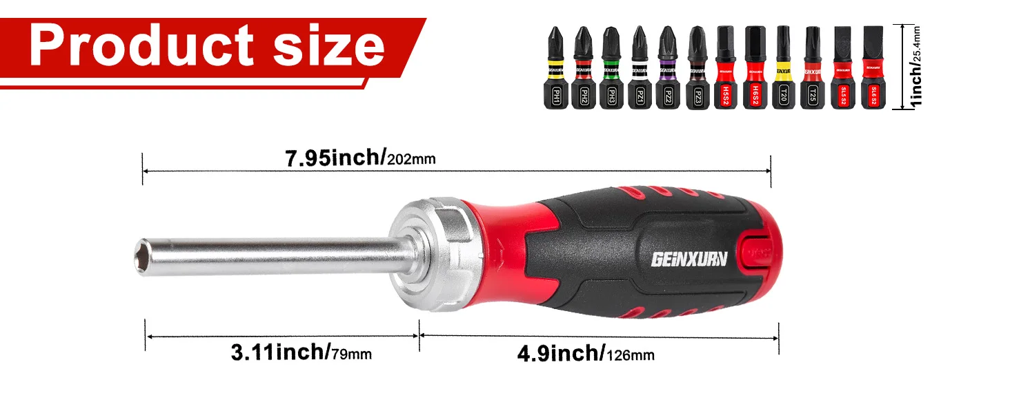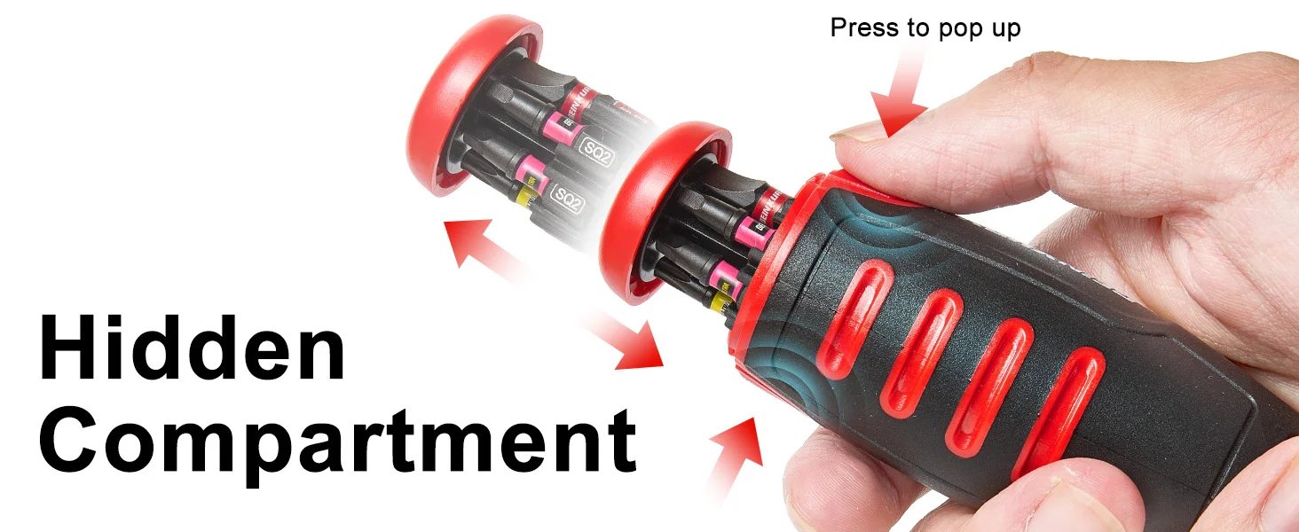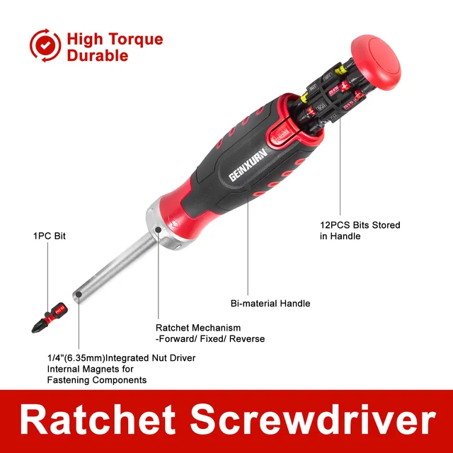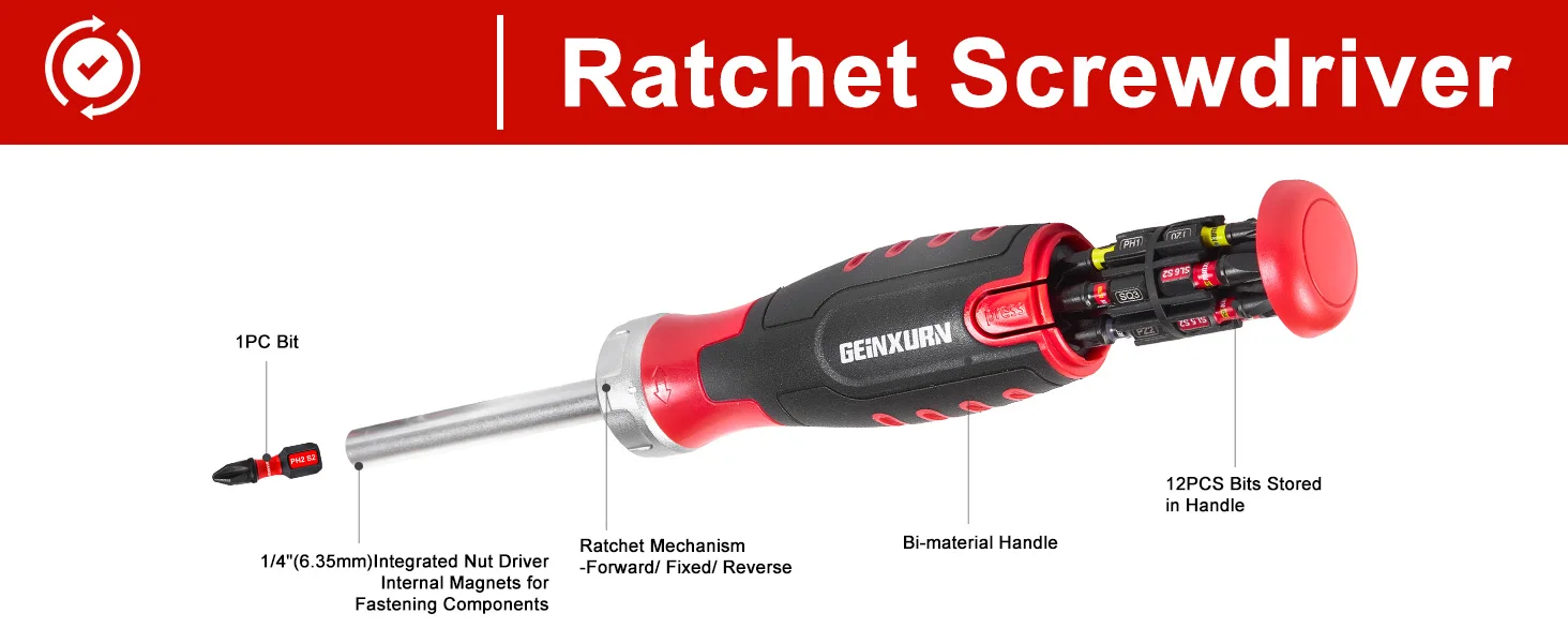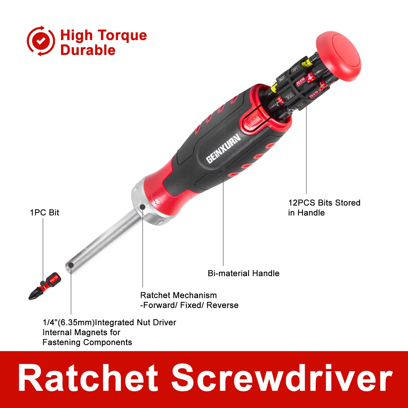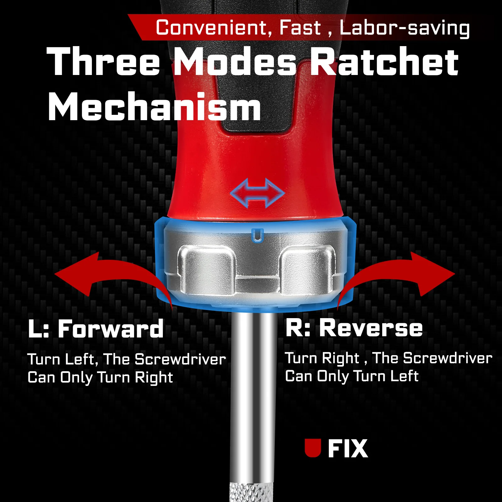 3-mode ratchet mechanism, 12 bits in handle, and magnetic nut driver for effortless repair and assembly.