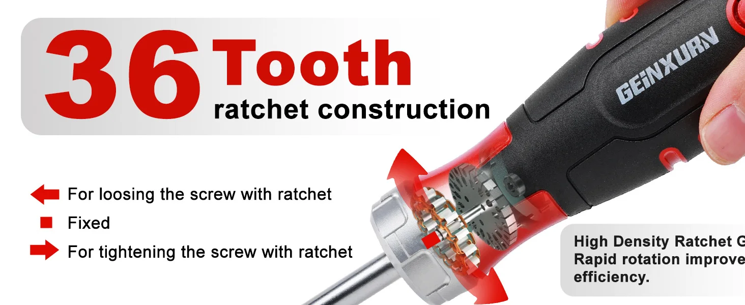 36-tooth ratchet mechanism allows for precise torque and rapid rotation in tight spaces.