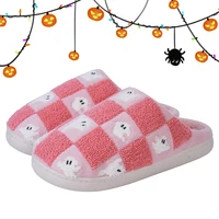 Ghost Checkered Plush Slippers Halloween Warm Flat Shoes Comfortable Thermal Closed Toe Slippers Non-Slip