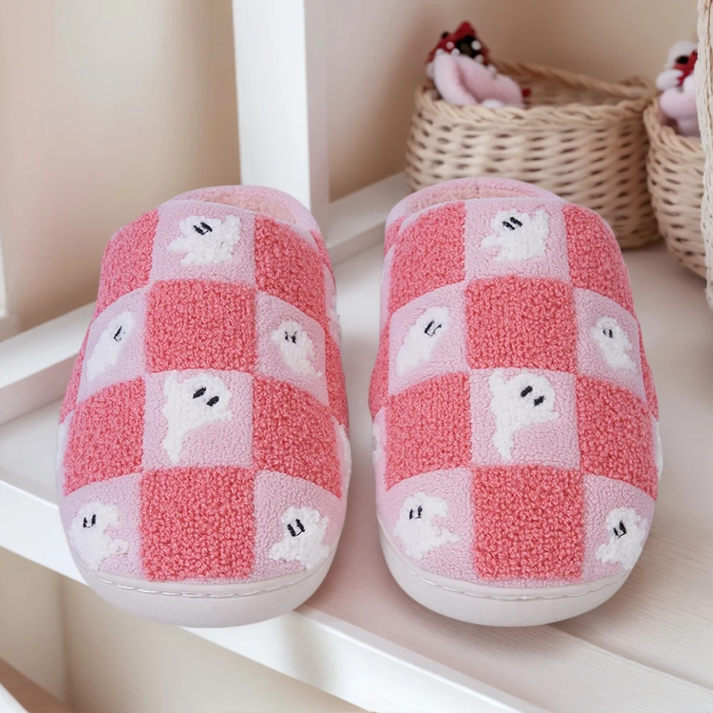 Ghost Checkered Plush Slippers Fuzzy Checkerboard Slippers Comfortable Thermal Closed Toe Slippers Non-Slip for Indoor Bedroom
