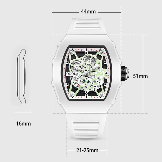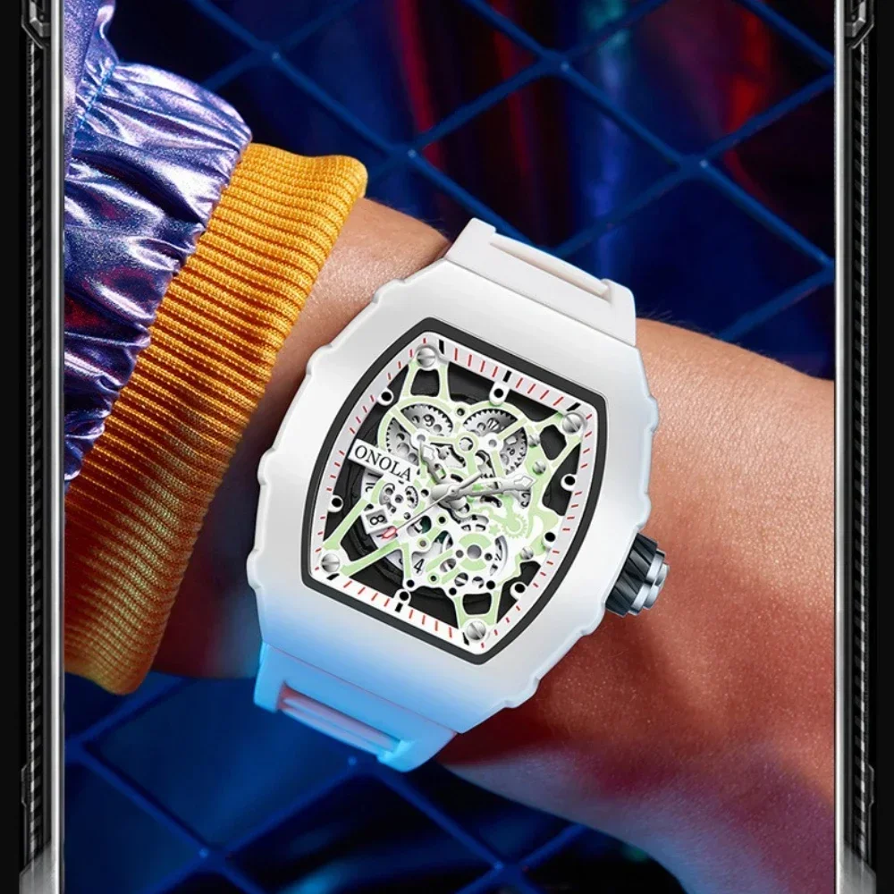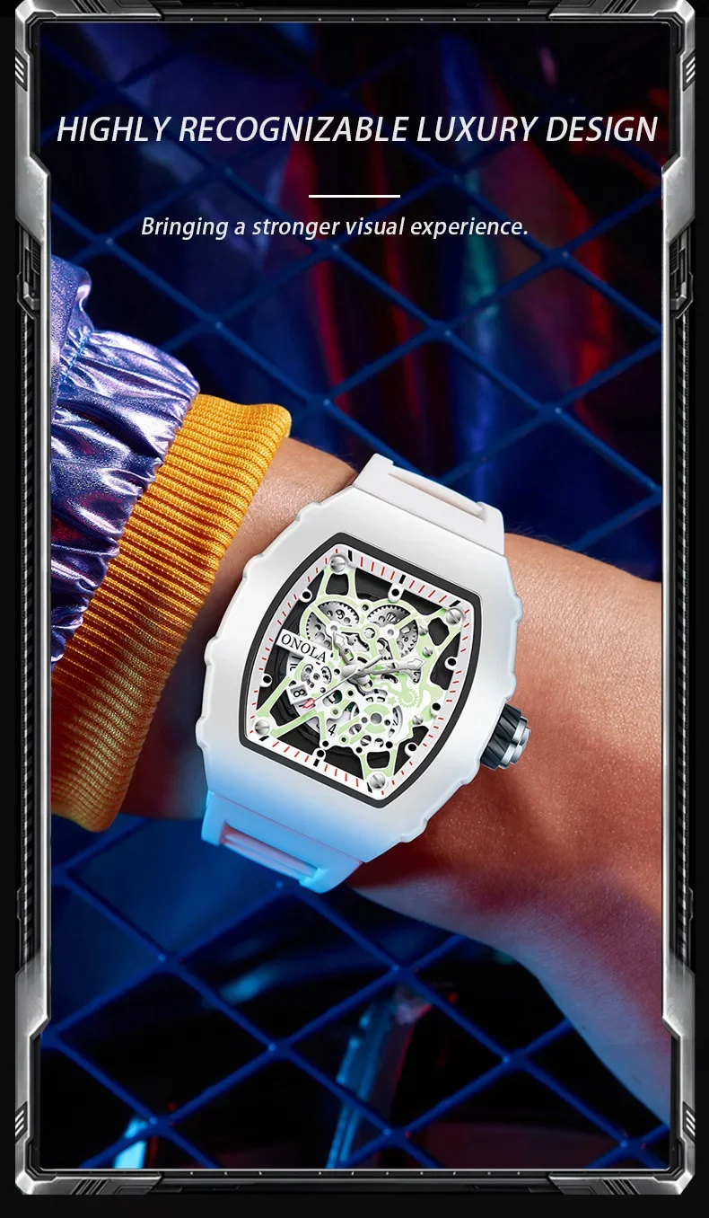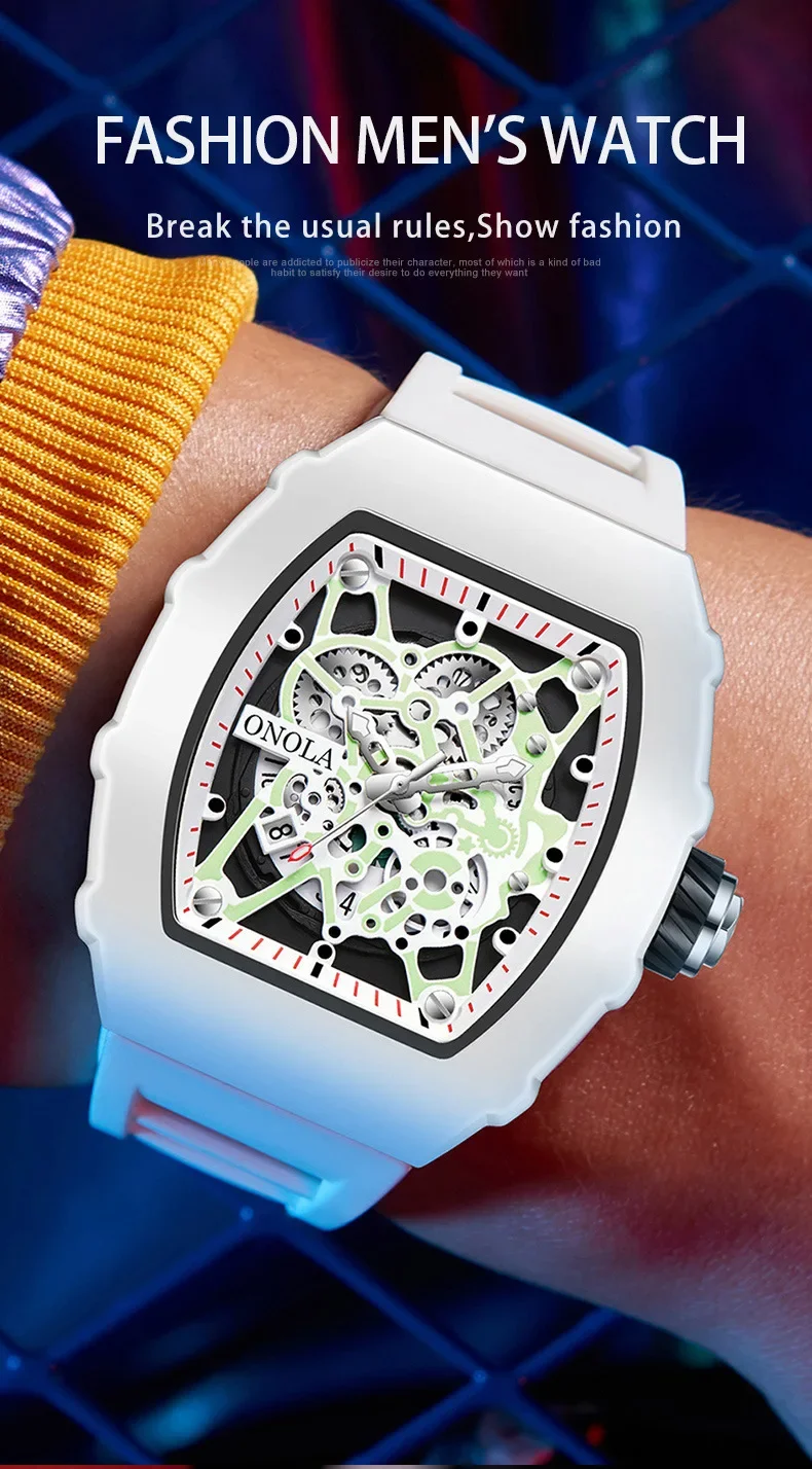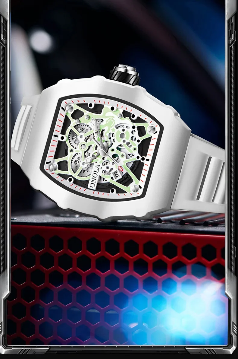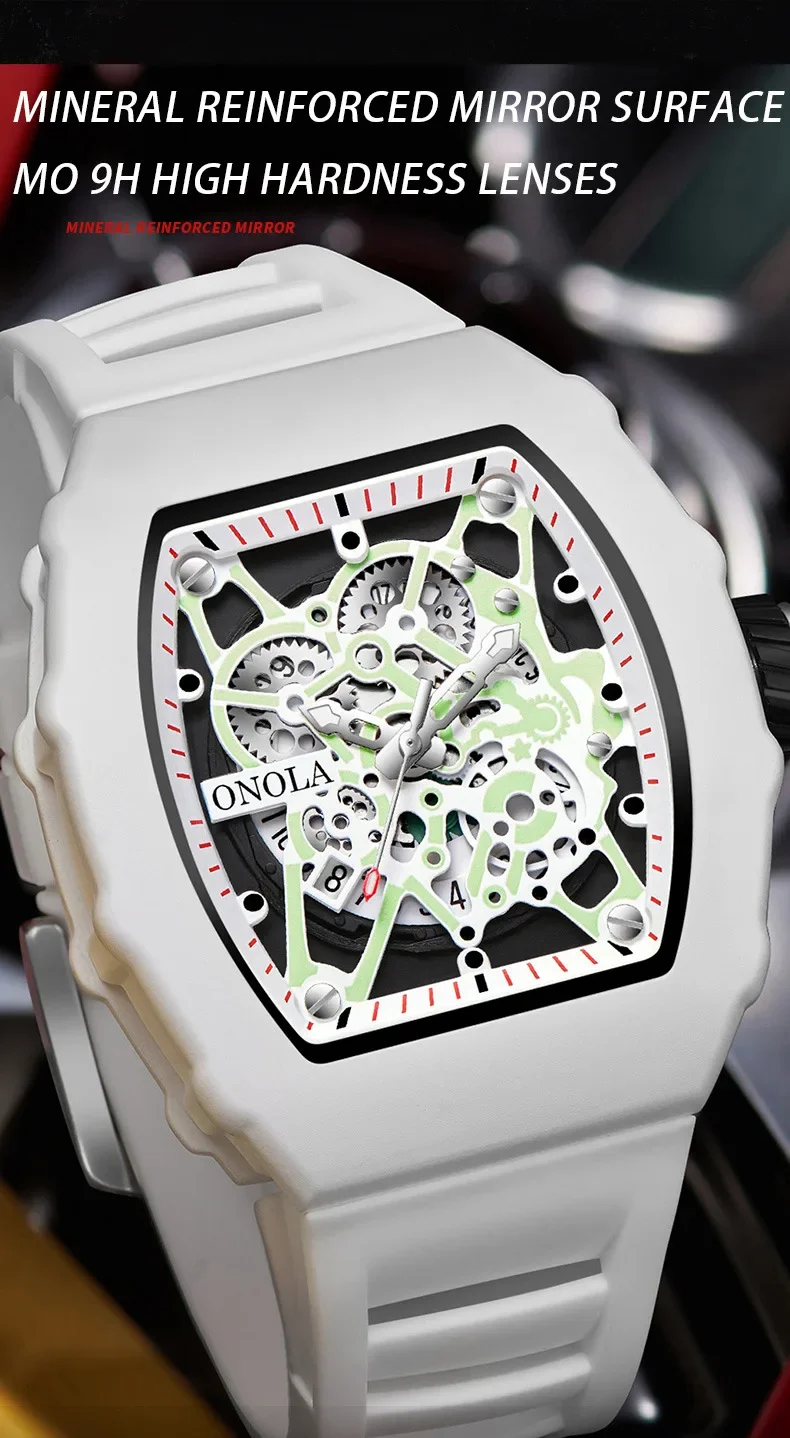 Gift Box Watches for Man ONOLA 3827WGM Tonneau Trend White Quartz Wristwatch Sports Silicone Strap Luminous Waterproof Man Watch
