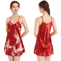 Gift for Women Pajamas Satin Nightgown Crane Print Sleepwear V Neck Lingerie Sexy Spaghetti Strap Nightwear