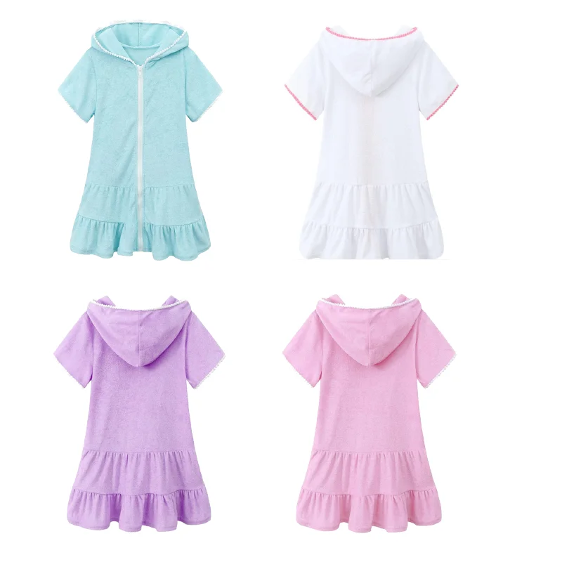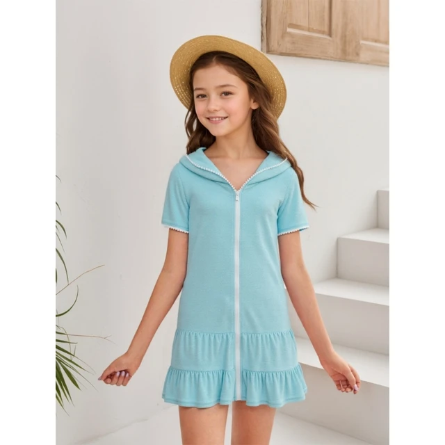 Enhancing your little girls summer wardrobe with this essential beachwear piece, designed to offer comfort and sun safety.