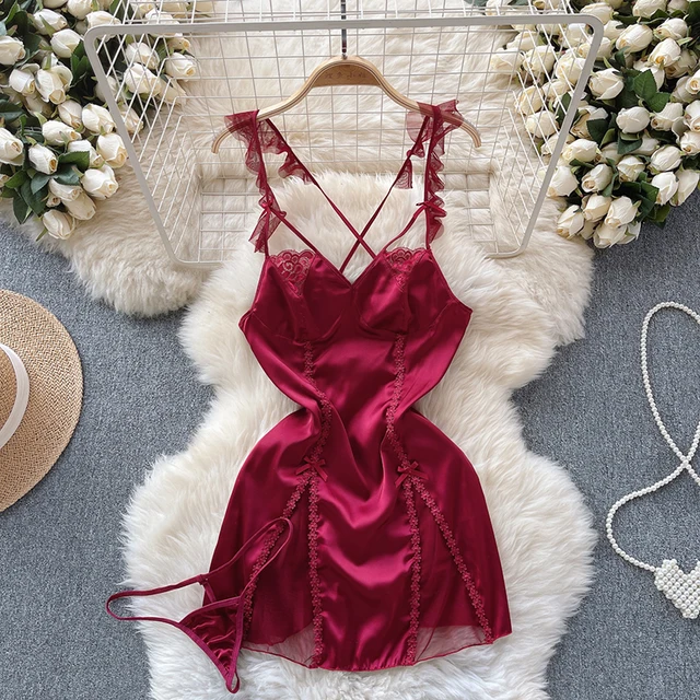 Strap Bow Hot Women Nightwear Mesh Sexy Night Dress Thin Tansparent Lace Pajamas Dress+Thong 2024 Lady Romantic Backless Nightie