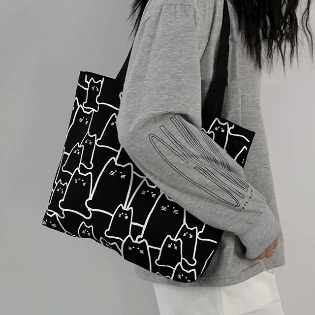 -51%Canvas Bags Handbag for Women Shopper Cute Cat Tote Bag with Zipper Designer Bag Japanese Style Cartoon Small Shoulder Bags