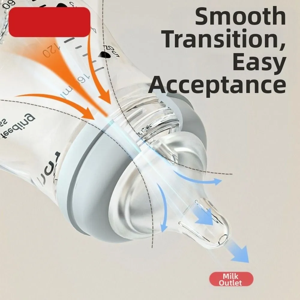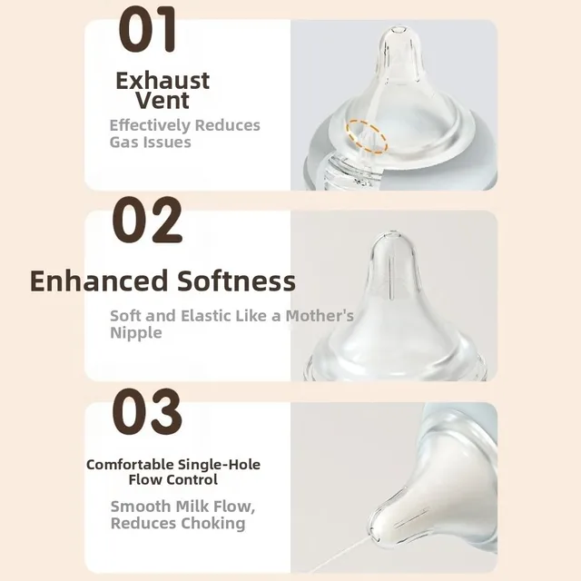 The pacifier is made of food-grade silicone material, which is super soft and stretchable. It is anti-colic and sucks the pacifier in one breath, allowing the baby to suck milk in one breath without inhaling too much air to prevent bloating.