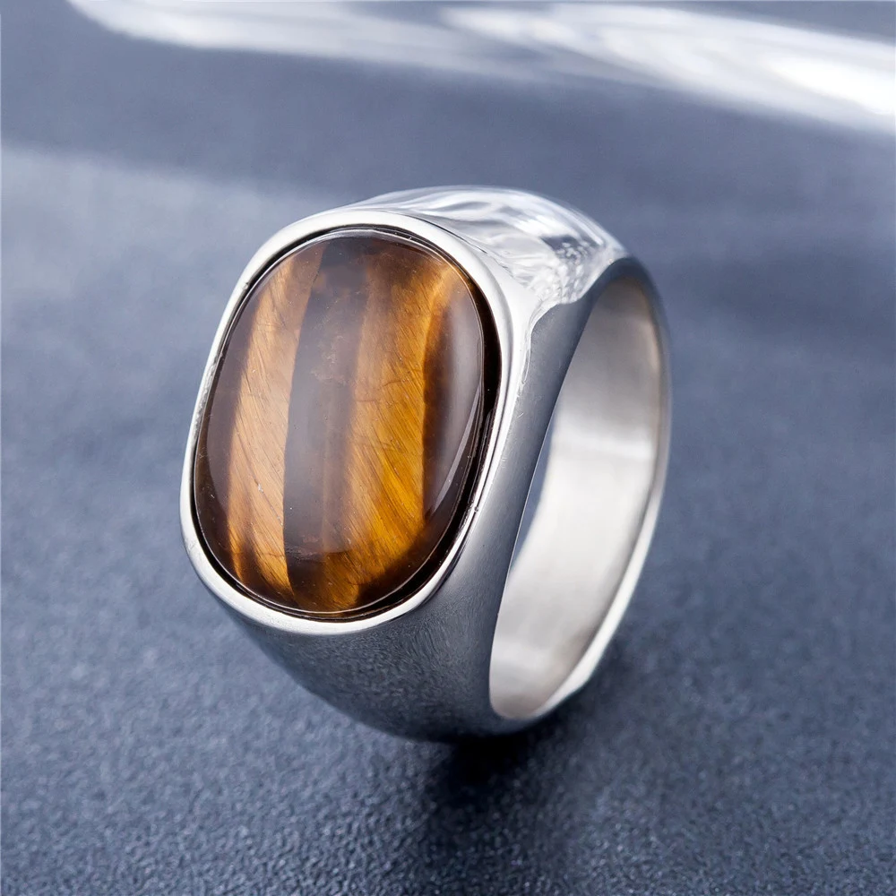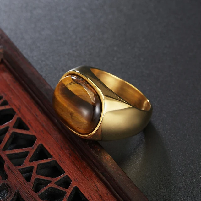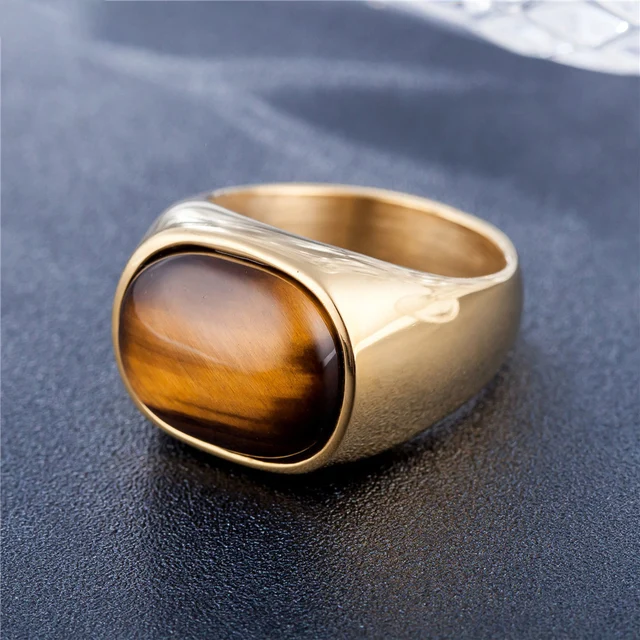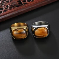 Name:Gold/steel Color Retro Tiger Eye Brown Stones Rings For Men Women Classic Elegant Simple Stainless Steel Stone Ring Jewelry Gift