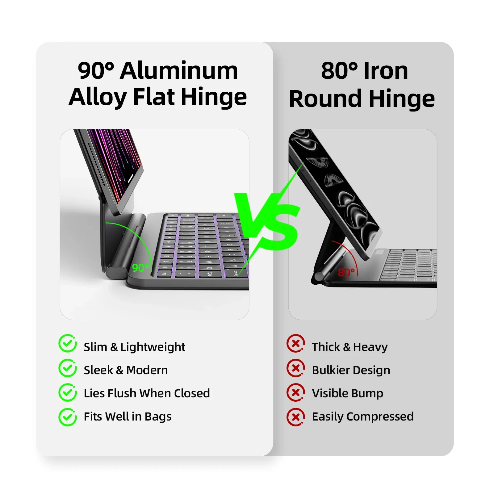 Stable 90° Flat Shaft: Thinner and lighter than round hinges, the magic keyboard case lies flush when closed with no bump, providing a slim, sleek profile. Besides, it locks securely at a 90° angle, providing stable, wobble-free support and an optimized typing experience.