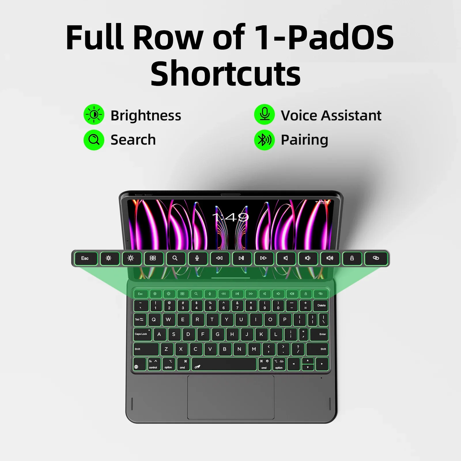 Full Row of iPadOS Multimedia Shortcut Keys: Provides quick access to essential functions like brightness, volume, and media controls without leaving your current app, enhancing navigation efficiency.