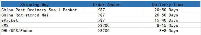 1.we ship all of our items to worldwide within 48hours by china post registered mail/ePacket/china post ordinary small packet/DHL/EMS.