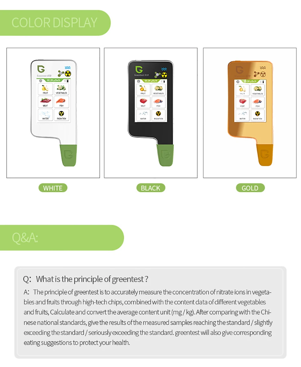 Greentest can detect toxins in 64 various kinds of vegetables and fruits and test out the harmful substances inside, such as the high nitrates. Green=Safety, Yellow=Notice, Red=Danger!