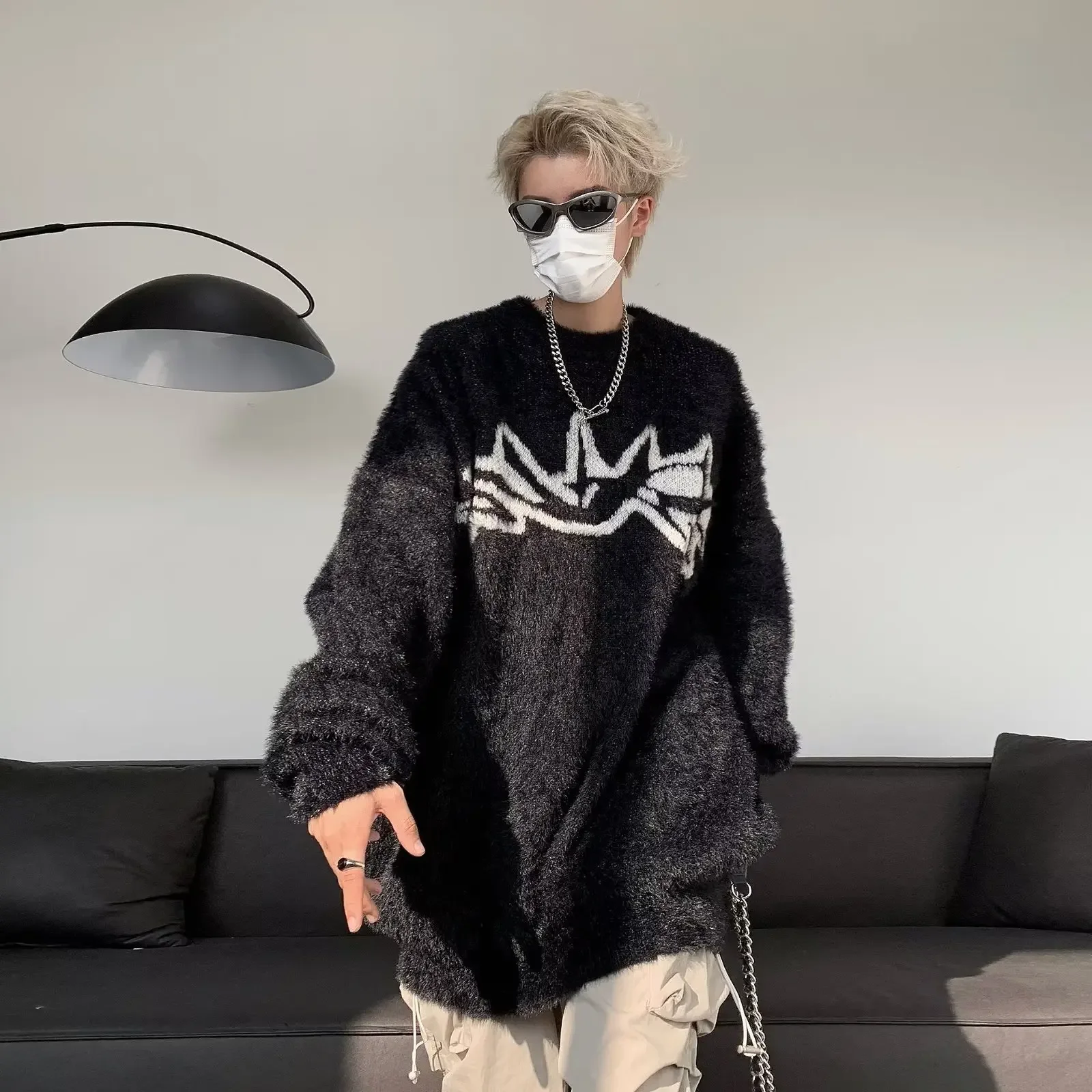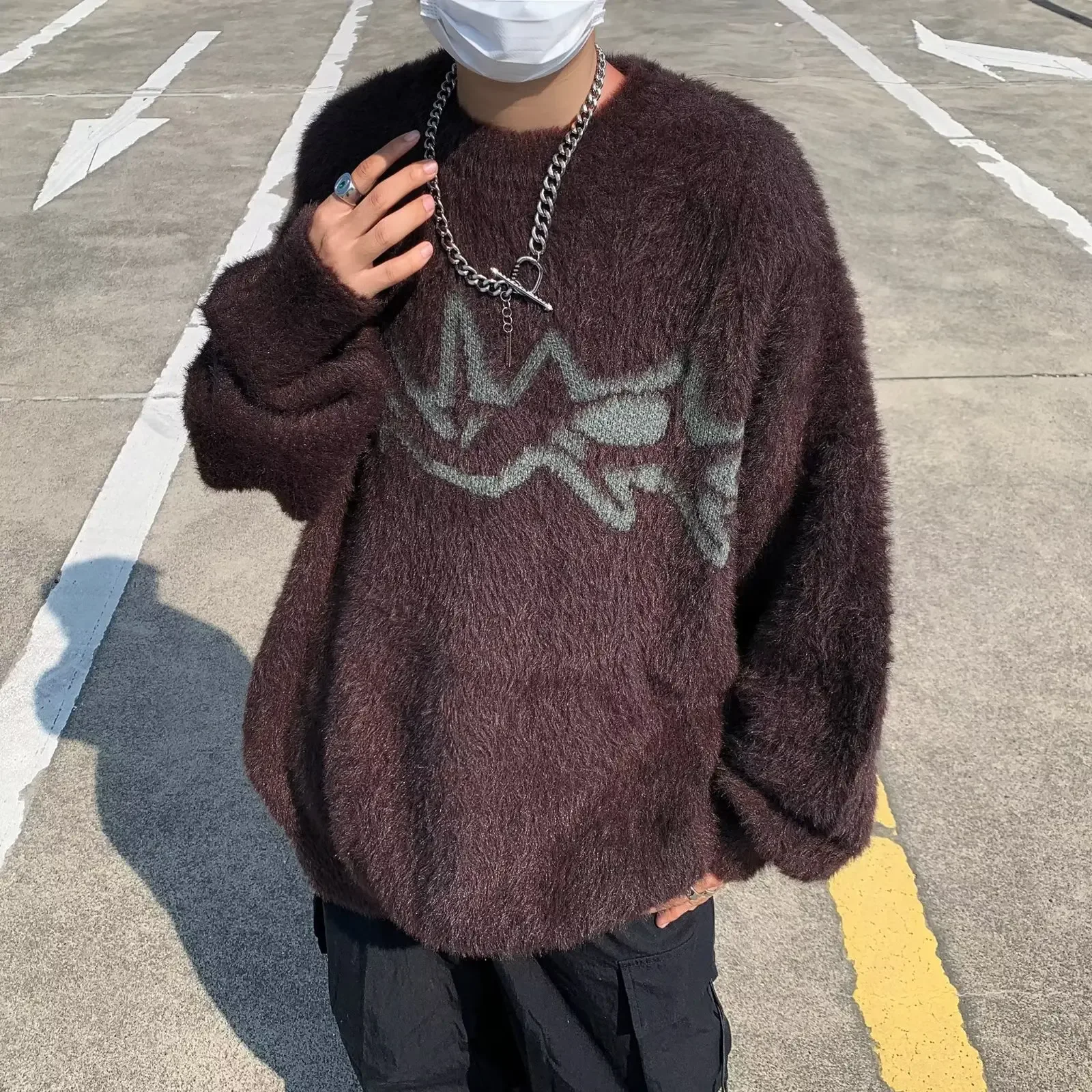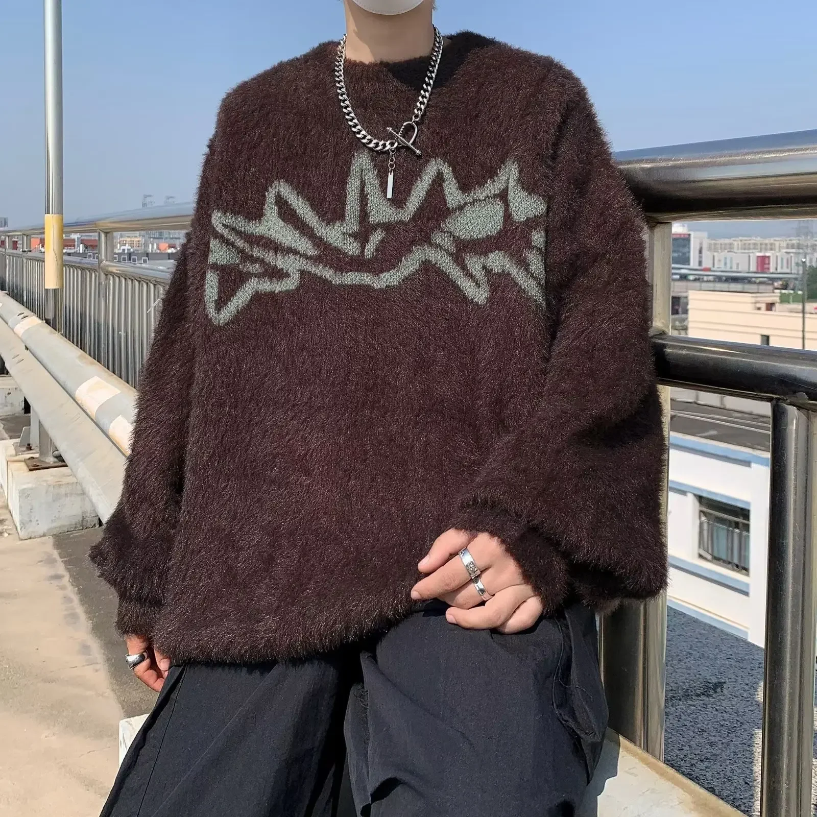 GuoTrendy Loose-Fit Round Neck Sweater Men’s Casual Vintage Streetwear Oversize Japanese Style