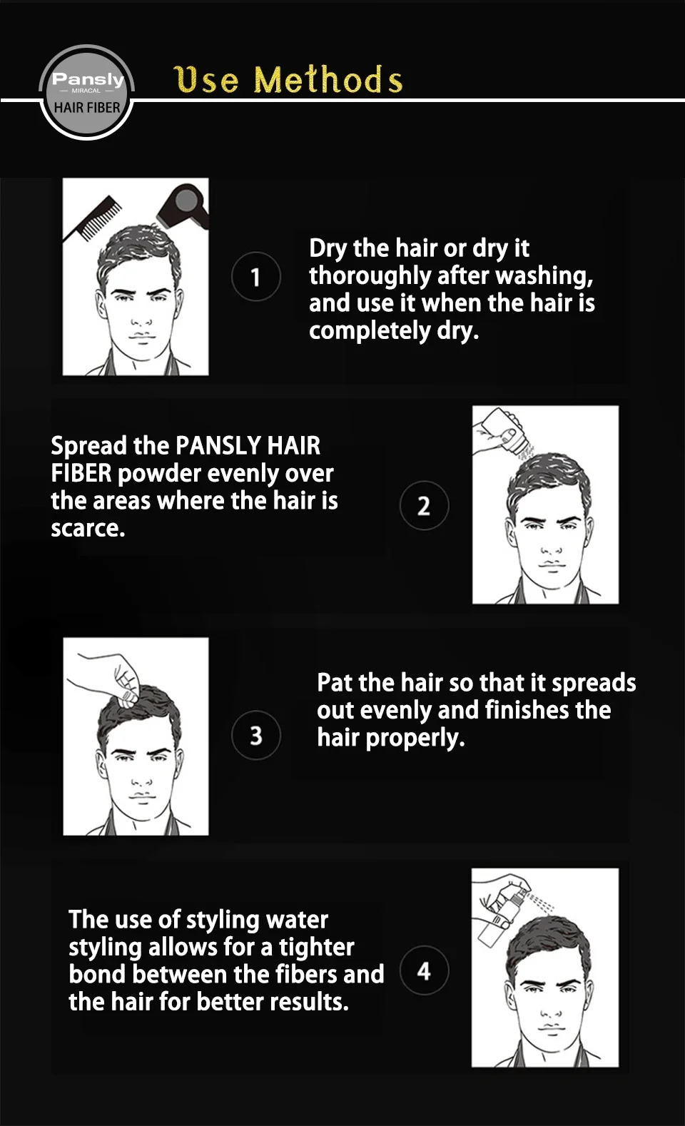 4. It’s fine to shape your hair with a comb after use the product,but try to keep a little distance from hair root to avoid the fiber falling,if it falls,it can be restored by reusing.