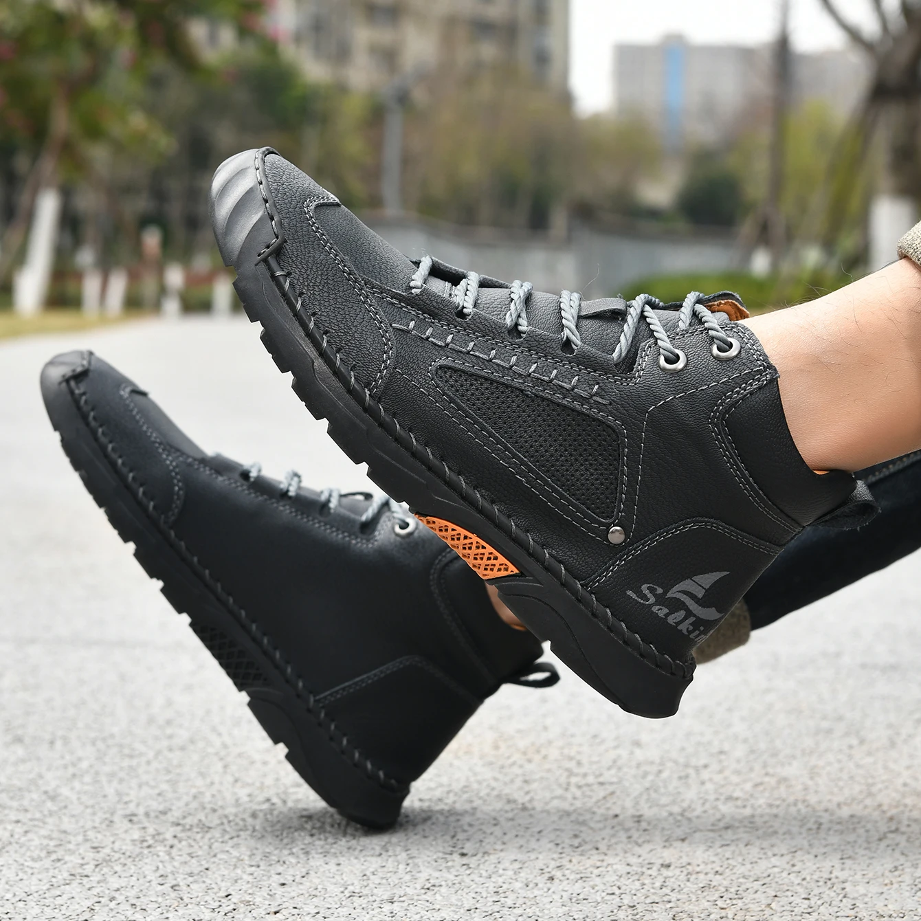 Hand-stitching Casual Leather Shoes Men Boots Outdoor Autumn Retro Breathable Casual Shoes Lace Up Khaki