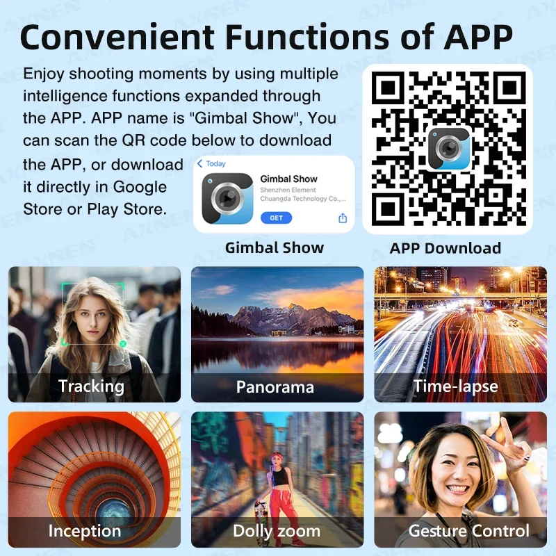 Enjoy shooting moments by using multiple intelligence functions expanded through the APP. APP name is “Gimbal Show”, You can scan the QR code below to download the APP, or download it directly in Google Store or Play Store.