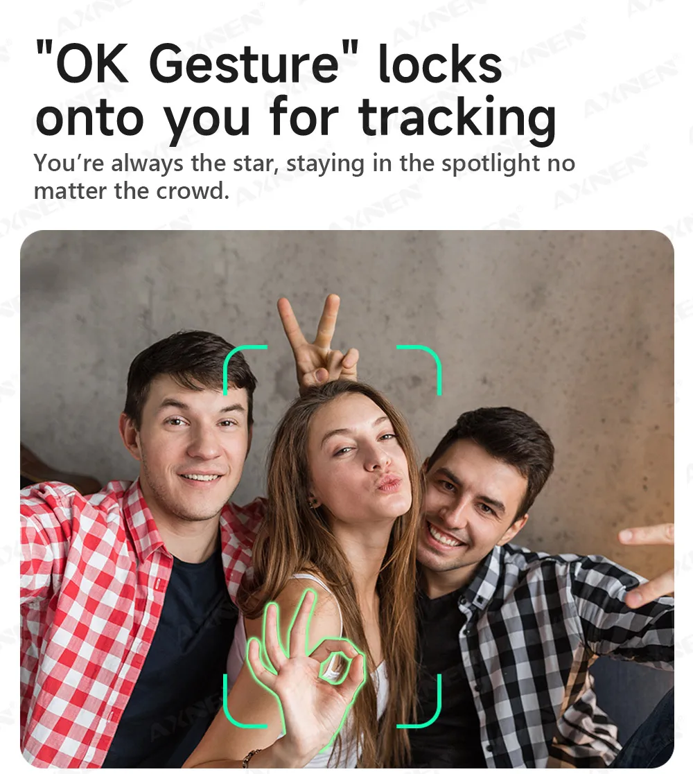 Start recording or take photos with just a gesture, easily switch between portrait and landscape modes while tracking.